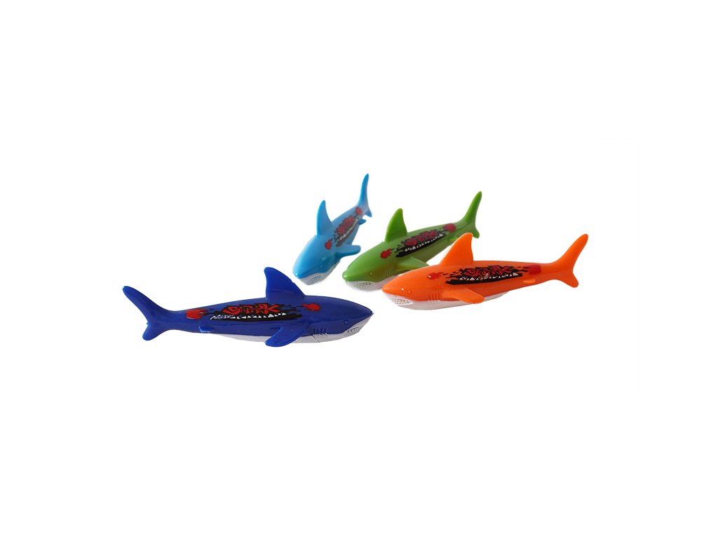 4 színes cápa, amelyek a vízbe dobva elsüllyednek, és neked kell őket kihalásznod.