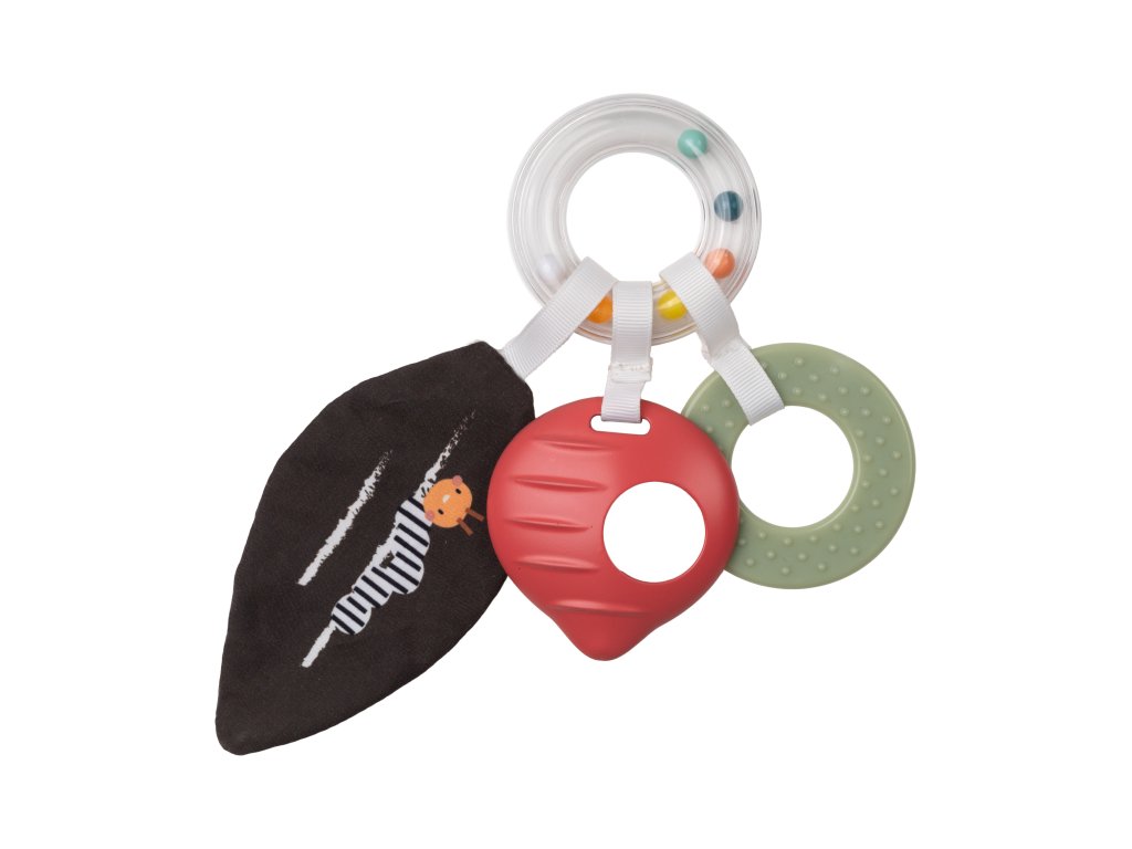 - Csörgő és rágóka: A karikás csörgő rágókákkal és susogó levéllel segíti a finommotorika és a kézkoordináció fejlesztését.