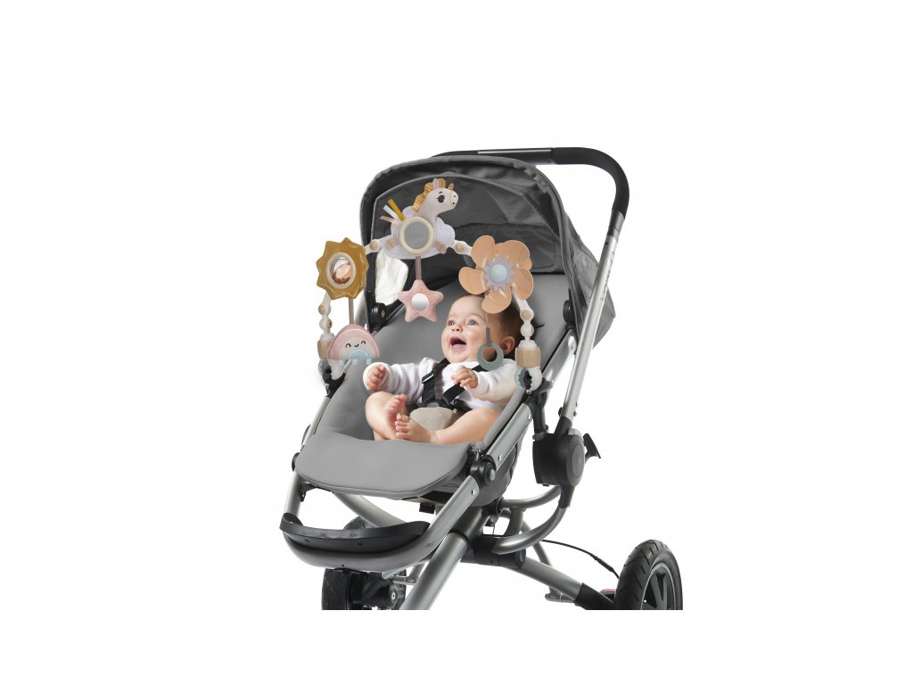 A Tiny Love Unicorn Wonderlands játékív finom pasztellszínekben, mesés unikornis motívummal, amely alkalmas babakocsira, autósülésre vagy pihenőszékre. Számos tevékenységet kínál a gyermek szórakoztatására útközben és otthon is, pl. csörgő, rágóka, forgó propeller vagy biztonságos tükör.