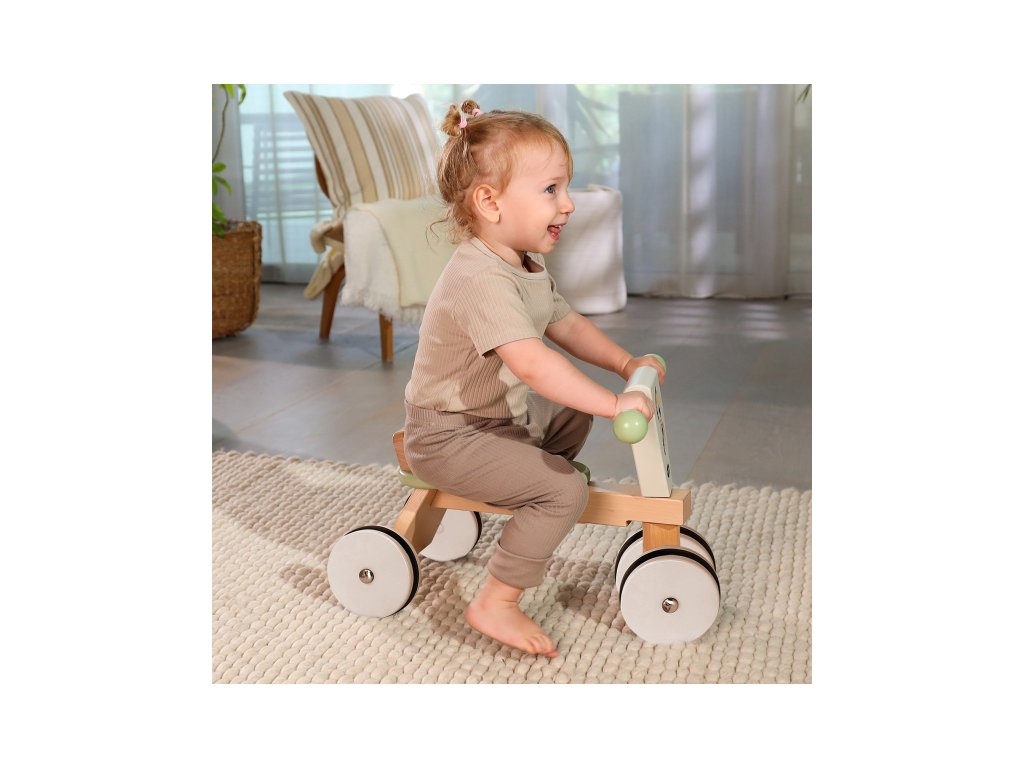 A minőségi fából készült, háromkerekű formájú gyermekjárgány stabilitást, kényelmes, széles, háttámlás ülést és kényelmes kormányt kínál. A gumírozott kerekek sima futást biztosítanak és védik a padlót a karcolásoktól.