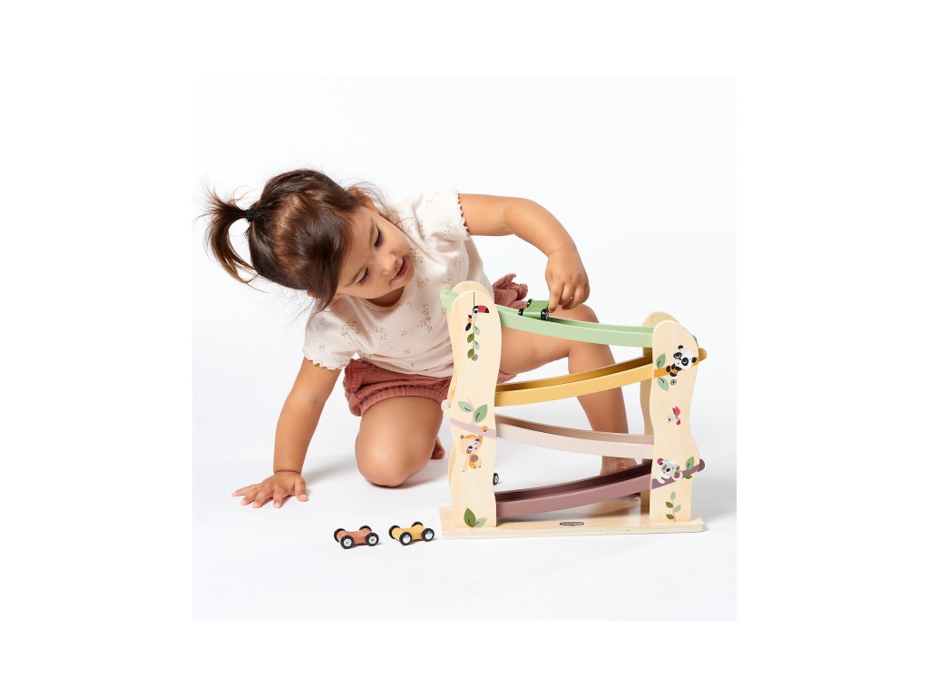 A gyönyörű nyomtatással ellátott, fából készült versenypálya négy faautóval rengeteg szórakozást biztosít gyermekének!