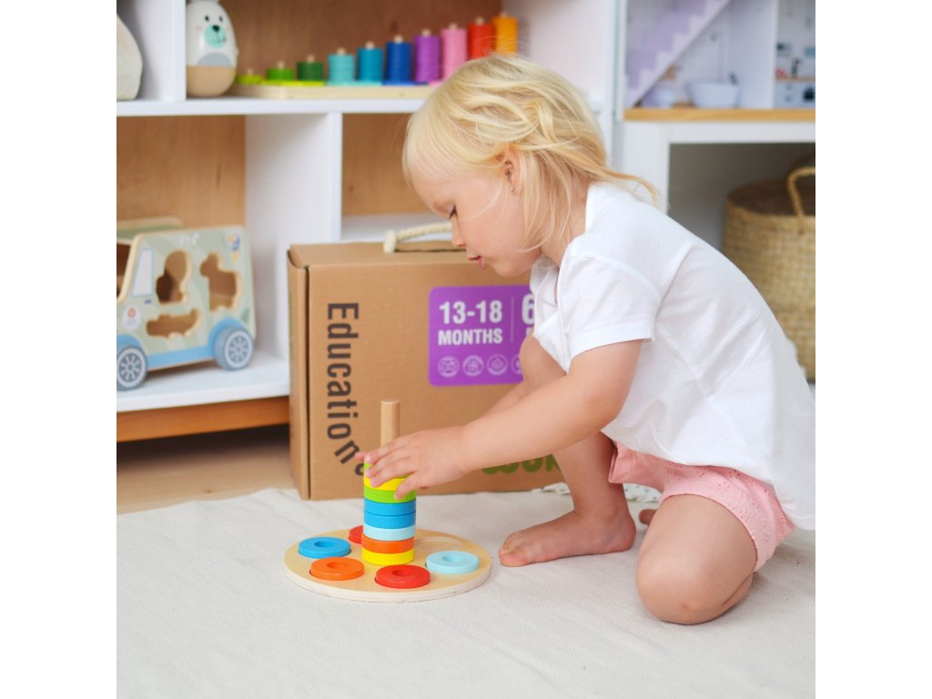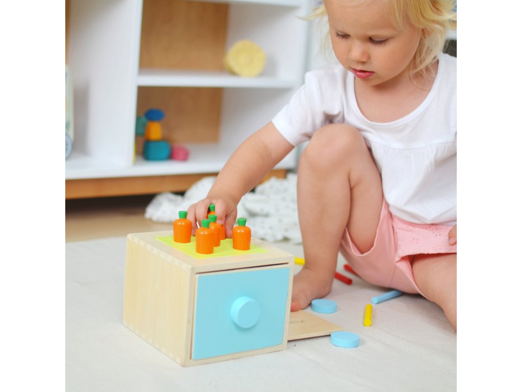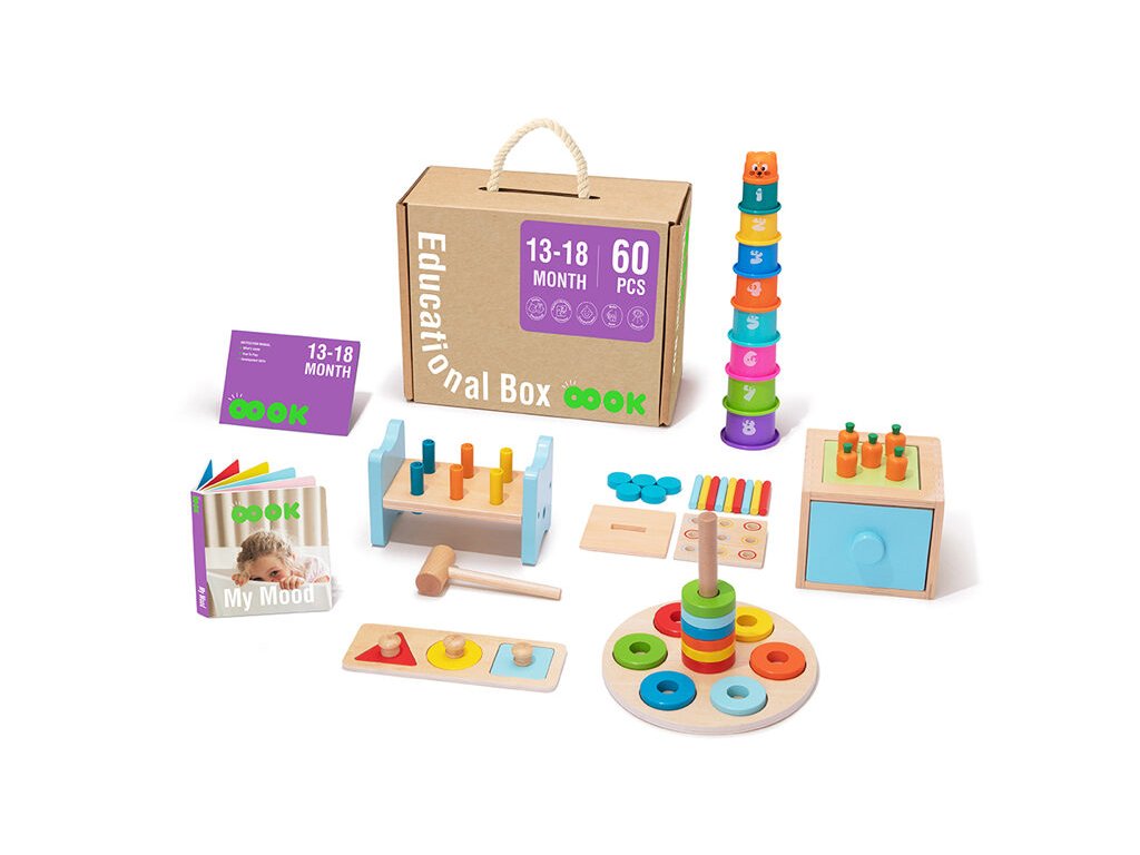 13–18 hónapos Edukációs doboz Midi 6 db 6 oktatójáték 1 éves kortól egy csomagban. A Tooky Toy Midi oktató doboz körülbelül egyéves kortól 18 hónapos korig ajánlott csecsemőknek. 6 montessori didaktikus játékot tartalmaz 1 éves kortól gyermekeknek, amelyek támogatják gyermeke egészséges pszichomotoros fejlődését, fejlesztik érzékszervi érzékelését, logikus gondolkodását, szem-kéz koordinációját, finommotorikáját és egyebeket. Tartalmaz egy részletes szülői útmutatót is, amely segít tudni, mikor melyik játékot mutassa be gyermekének, és hogyan játsszon vele.A doboz tartalma:faillesztő és -rakosgató, faillesztő puzzle 3 geometriai formával, fa kalapálójáték kalapáccsal, montessori dobozillesztő 3 az 1-ben, My Mood (Hangulatom) képeskönyv, egymásra rakható poharak számokkal, használati útmutató angol nyelven.Biztonságos oktatójátékok a legkisebbeknek. Az Edukációs doboznak köszönhetően nem fog feleslegesen sok nem megfelelő vagy műanyag játékot vásárolni. A Tooky Toy didaktikai játékok a környezet védelmére való tekintettel, fenntartható erdőgazdálkodásból származó fából és más biztonságos anyagokból készülnek. A színek nem mérgezőek és teljesen biztonságosak. Amikor a gyermek felnő, továbblép a következő 19–24 hónapos Edukačný box-ra, és ezt a fiatalabb testvéreknek hagyhatja, vagy odaadhatja valaki másnak. A Tooky Toy oktatódoboz 1 éves kortól alkalmas ajándéknak.
