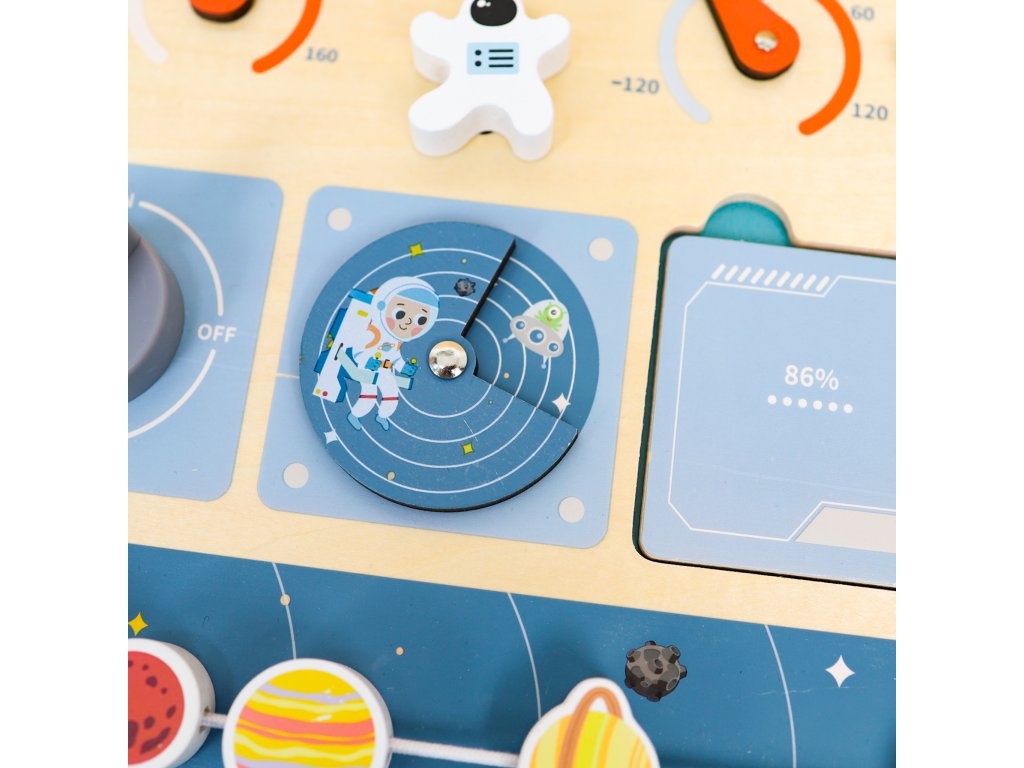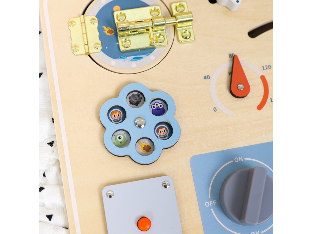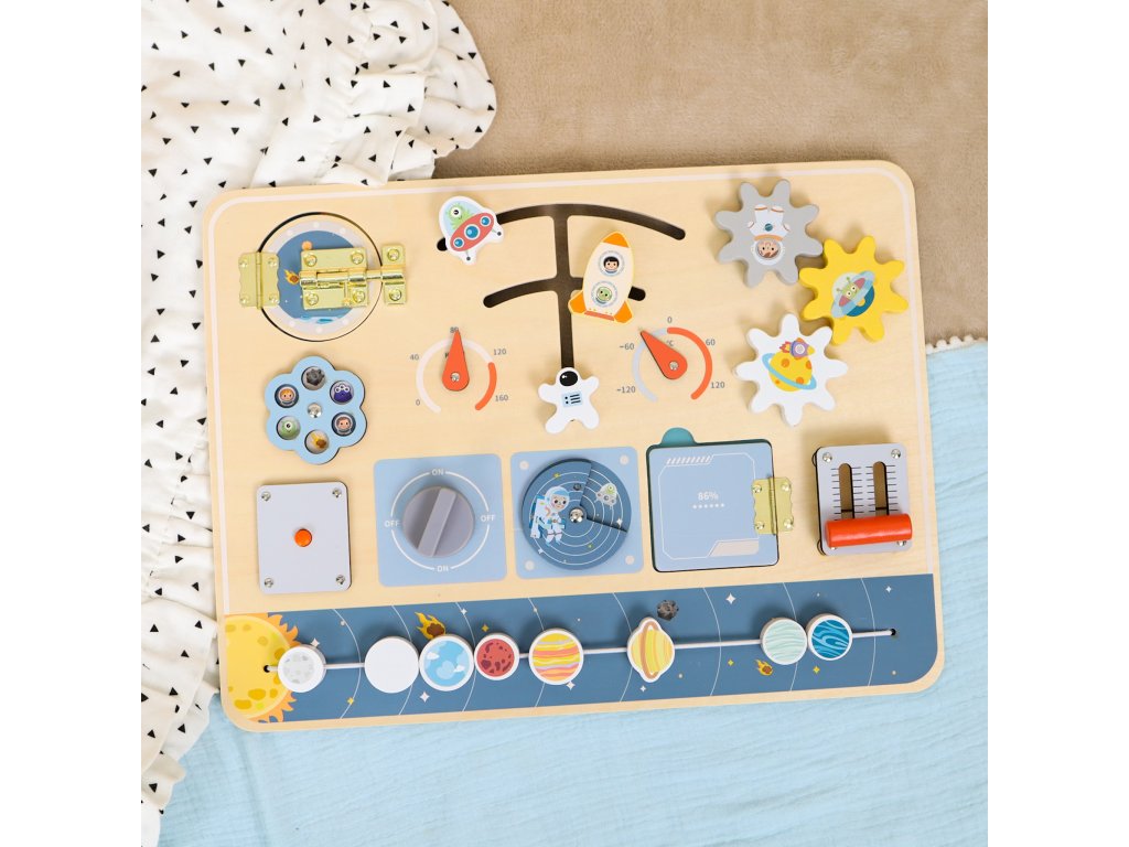 Űrlaptevékenység Világegyetem Különböző motoros tevékenységek egy játékban A Tooky Toy kifinomult fa tevékenységi táblája időtlen pasztell színekben különféle motoros tevékenységeket tartalmaz, amelyek tökéletesen szórakoztatják gyermekeit, és sok mindenre megtanítják őket. A táblán találhatók csúszó kezek, fogaskerekek űrmotívumokkal, bolygóformák zsinóron vagy zárószerkezetek.A motoros játék szórakoztatja és fejleszti a gyerekeket. Az Activity board először a kisebb gyerekeket szólítja meg motoros elemekkel, melyeknek köszönhetően fejlesztik finommotorikájukat. A gyerekek fokozatosan megismerik a formákat és ismétlik a színeket az aktivitásokkal. Az activity board tömör fából készült, fenntartható erdőgazdálkodásból származik, nem mérgező festékekkel van festve, és biztonságos a gyermekek számára. Remek ajándék gyermekeknek, például a 2. születésnapjukra.