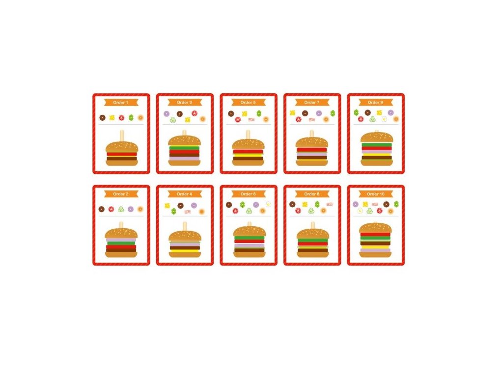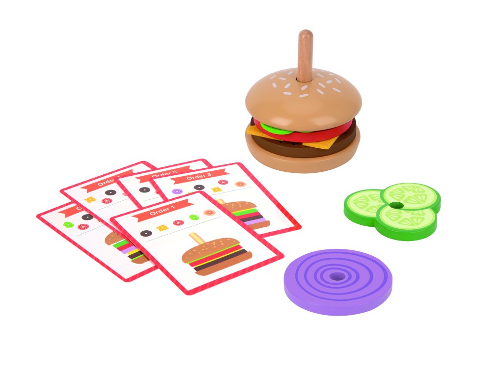 Rakd össze a hamburgert! Összefut a nyál a szádban egy kiadós hamburger láttán? Fából készült burger hozzávalók zöldségek, hús, sajt, tojás formájában, és nem hiányozhat a zsemle teteje sem. Mindegyik felhelyezhető a fa alap rúdra.Rakja össze ízlése szerint, vagy a tíz kombináció egyikéből. A játék fejleszti a gyermekek motorikus és logikus gondolkodását. Minőségi fából és nem mérgező festékekből készült.