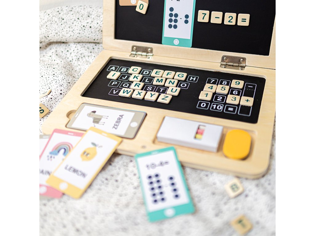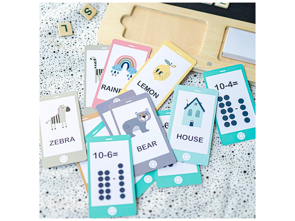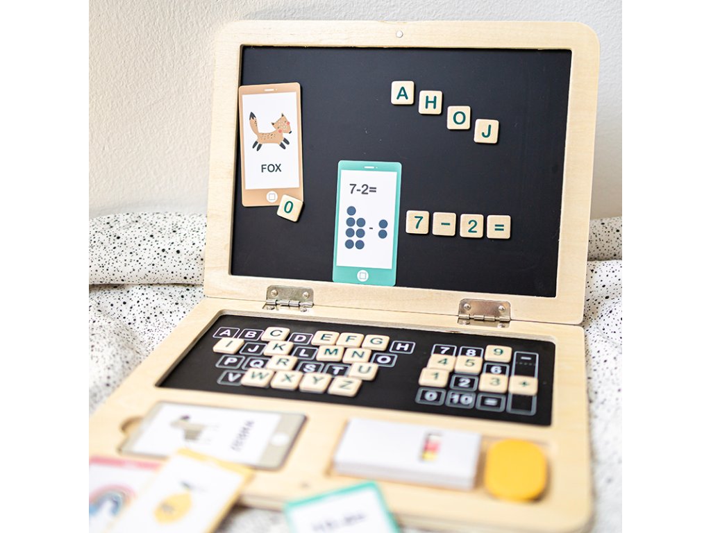 Fából készült notebook táblával A szavak tanulása és a rajzolás soha nem volt még ilyen szórakoztató! Fa notebook mágneses táblával, az ábécé összes betűjének és a 0-tól 9-ig terjedő számoknak a mágneseivel.A gyermek színes krétákkal rajzolhat a képernyőre. A csomag tartalmaz egy törlőgumit és egy kártyakészletet is, különféle állatok vagy dolgok illusztrációival és neveivel.