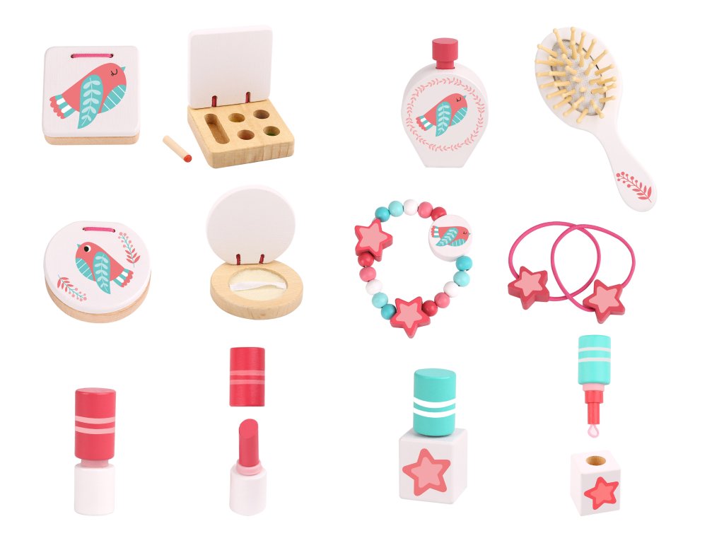 Fésülködő asztal Fa fésülködő asztal divat iránt érdeklődő gyermekek számára. Már a kisgyerekek is szívesen utánozzák a felnőtteket, ezért szeretnek a lányok csinoskodni. Akár hercegnőnek, modellnek vagy anyukának szeretnének öltözni, egy kis kozmetikai asztal segíthet nekik ebben.A kiegészítők sora sok szórakozást biztosít. A tükör mellett a kozmetikai asztal saját tárolóhelyekkel is rendelkezik 2 fiók és 2 tárolópolc formájában. A kiegészítők – rúzs, körömlakk, púder, tükör, hajkefe, gumiszalag, karkötő vagy parfüm – elpakolásával sem lesz gond. A fa készlet 3 éves kortól alkalmas gyermekek számára.