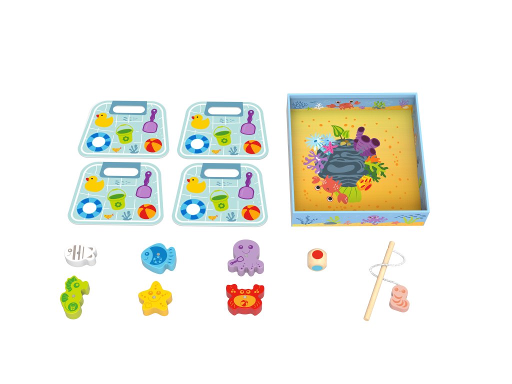 Halacskafogás Tenger Szórakozás az egész családnak! A Tooky Toy Chytanie rybičiek nevű fa társasjáték már 18 hónapos kortól szórakoztatja a legkisebbeket. Játszhatnak vele egyedül, és gyakorolhatják a finommotorikát a tengeri állatok fogásával, vagy az egész család játszhat a mellékelt szabályok szerint. A játék tartalmaz 1 horgászbotot, 1 kockát, 1 tengert ábrázoló alátétet, 6 fa tengeri lényt és 4 kartonlapot játékokkal, amelyek a játék során pontok gyűjtésére szolgálnak.A halacskafogás fejleszti a készségeket. A gyerekek először finommotorikájukat, mozgáskoordinációjukat és türelmüket gyakorolják. Ahogy nőnek, fokozatosan megismerkednek a társasjátékokkal és az alapvető szabályok betartásával, mint például a kockadobás, a sorrendváltás, a győzelemmel, illetve a vereséggel való megbirkózás. A Tooky Toy fajátékok a gyermekek biztonsága és a környezetre gyakorolt minimális hatás érdekében készülnek, minőségi és biztonságos anyagokból.A játék útmutatóját itt találja!