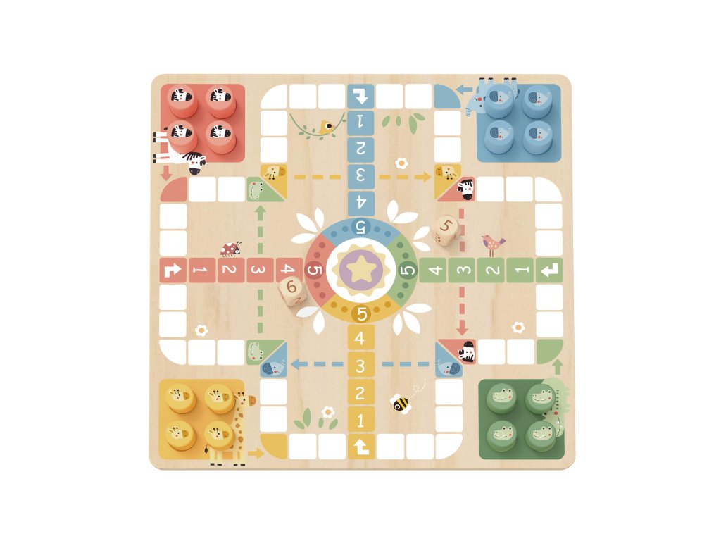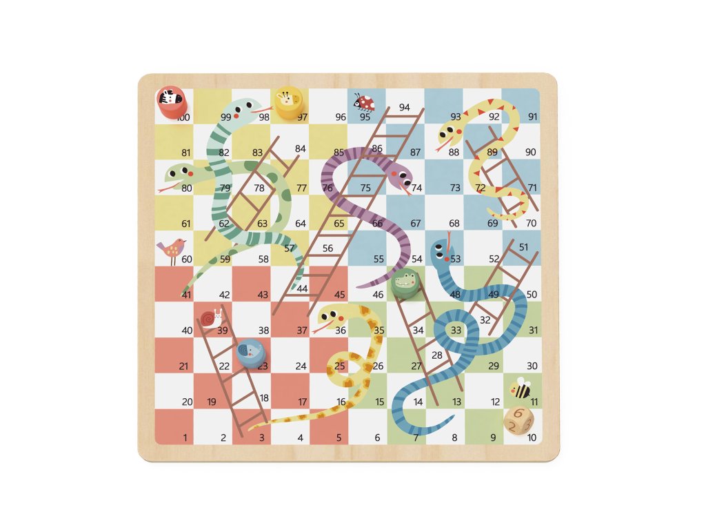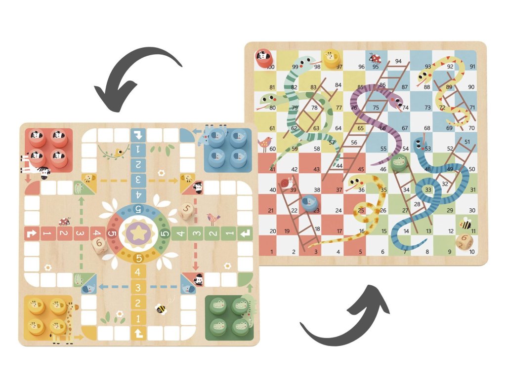 2 az 1-ben társasjáték Ki nevet a végén!, Kígyók és létrák Pasztell A 2 az 1-ben játék az egész családnak tetszeni fog A Took Toy pasztell színű, kétoldalas fa társasjátéka nem hiányozhat egyetlen háztartásból sem. A játéktábla egyik oldalán megtalálod a klasszikus Ember, ne mérgelődj! játékot. Választhatsz elefántok, zebrák, zsiráfok vagy krokodilok figurái közül. A játéktábla másik oldalán egy másik klasszikus található - a Kígyók és létrák játék.A gyerekek megtanulnak társasjátékozni A játéknak köszönhetően megtanulják, mi a vereség és a győzelem, a sorrendváltás, és fejlődnek a számolásban. A bájos játékfelszereléssel a gyerekek szívesen játszanak egyedül is. A fa tábla, a figurák és a kockák minőségi, fenntartható erdőgazdálkodásból származó fából készültek, nem mérgező festékekkel vannak festve és biztonságosak a gyermekek számára.Itt találod a játék szabályait