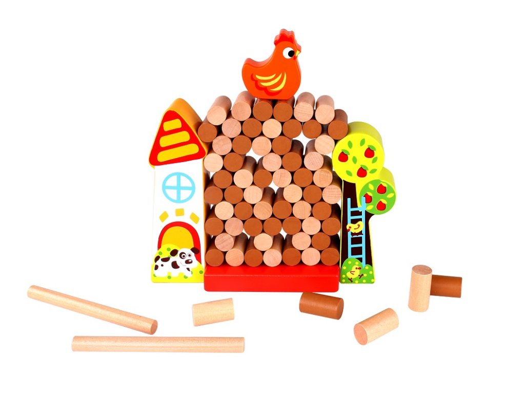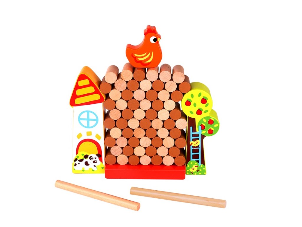 Jenga Tyúk az ólban Izgalmas párbaj a tyúkkal Vidám társasjáték, amely garantálja a szórakozást az egész család számára. Két játékos felváltva óvatosan kihúzza a fahengereket a ülő tyúk alól egy pálcika segítségével. A cél megakadályozni, hogy a tyúk leessen az ólbol. A játék türelmet, pontosságot és egy jó adag feszültséget igényel, mert minden rossz húzás nagy esést okozhat.Fejlődés és szórakozás egyben Ez a játék nem csak a szórakozásról szól, hanem a fontos készségek fejlesztéséről is. Támogatja a finommotorikát, javítja a szem-kéz koordinációt és fejleszti a koncentrálóképességet. A gyerekek a térbeli érzékelést is megtanulják, és fejlesztik a nyelvüket a játékról szóló beszélgetések során. Ez egy nagyszerű módja annak, hogy a gyerekeket türelemre és csapatmunkára ösztönözzük.Itt találod a játék szabályait