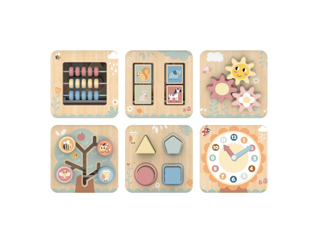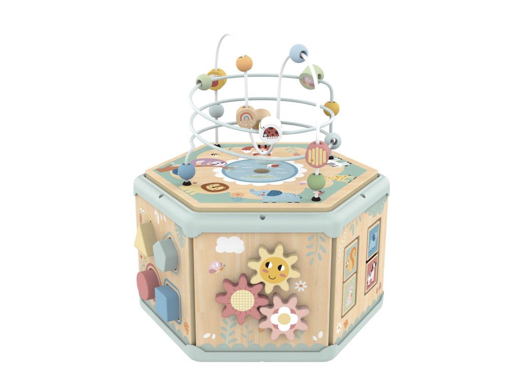 7 az 1-ben Pasztell Aktivitás Kocka Fa multifunkcionális hatszög 7 tevékenységgel Interaktív oktató játék a Tooky Toy-tól időtlen pasztell színekben, minden oldalán más típusú tevékenységet kínál, és egy a tetején is található. A gyerekek mozgathatják a gyöngyöket vagy állatokat a motoros labirintusban, forgathatják a fogaskerekeket, formákat helyezhetnek be, vagy tanulhatják az órákat. Számoló és memóriajáték is van. Ennek a fából készült activity boardnak a fantáziadús kialakítása önálló játékra ösztönzi a gyerekeket.A gyerekek játék közben tanulnak és fejlesztik finommotorikájukat. Az aktivitás kockával való játék fejleszti a gyerekek logikai gondolkodását, a szem-kéz koordinációt és különböző gyakorlati készségeket gyakorol. A kocka felső része a motoros gyöngyös labirintussal kinyitható. A behelyezhető formákon kívül különféle apróságokat is beletehetnek. Az aktivitáskocka fenntartható erdőgazdálkodásból származó tömör fából készült, nem mérgező festékekkel van festve és biztonságos a gyermekek számára.