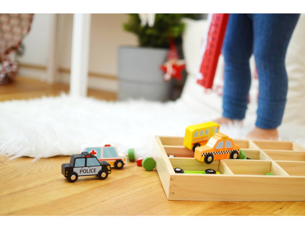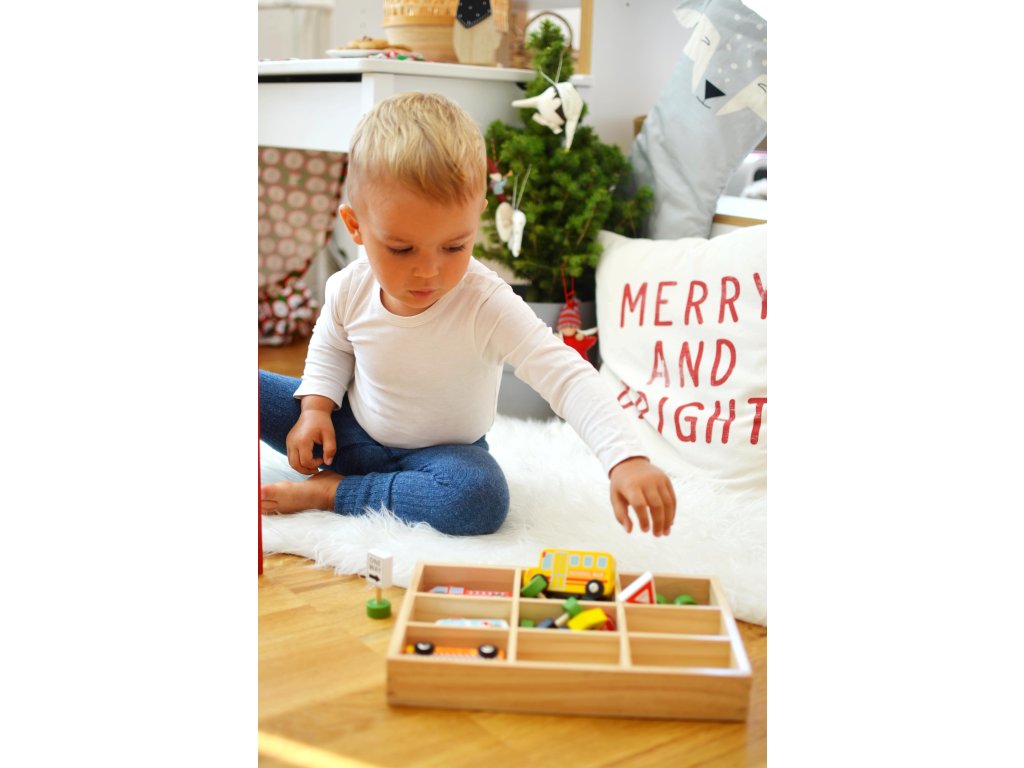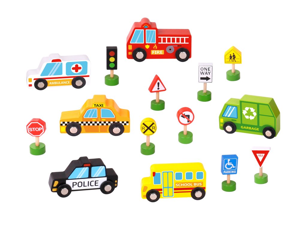 Közlekedési eszközök és jelzőtáblák – Rajta az útra! Ez a fa járművekből és közlekedési táblákból álló készlet szórakoztatja a gyerekeket, és órákra lefoglalja őket. A készlet 6 járművet (rendőrautót, mentőautót, tűzoltóautót, szemetesautót, taxit és iskolabuszt) és 9 közlekedési táblát tartalmaz.A játék során a gyerekek fejlesztik a finommotoros készségeiket. A párban való játék emellett elősegíti a szociális és kommunikációs készségek fejlesztését. Minden közlekedési jármű és tábla fából készült, és újra el lehet helyezni őket a polcokkal ellátott fa dobozba. Ezt a gyerekszobában játéktartóként is használhatja.