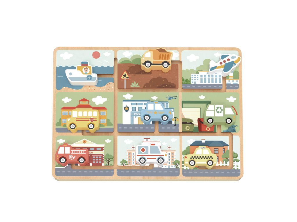 Labirintus Közlekedési eszközök Motoros labirintus 18 hónapos kortól alkalmas A Tooky Toy fa motoros labirintusa közlekedési eszközökkel, időtlen pasztell színekben, 18 hónapos kortól leköti a gyermekeket. Az eredeti activity board 9 különböző helyszín képét és 9 csúszó közlekedési eszközt tartalmaz. A gyerekek a síneken belül mozgatják őket, ahogy akarják. De hozzárendelhetik őket ahhoz a képhez is, amelyikhez tartoznak, például a tűzoltóautót a tűzoltóállomáshoz, a mentőt a kórházhoz vagy a hajót a vízhez.Nagyszerű a finommotorika fejlesztésére A csodálatos motoros labirintus fejleszti a mozgáskoordinációt, a koncentrálóképességet, a megfigyelési és a logikai képességeket is. A Tooky Toy gyermekeknek szánt fa játékok fenntartható erdőgazdálkodásból származó tömör fából készülnek, nem mérgező festékekkel vannak festve és biztonságosak a gyermekek számára.