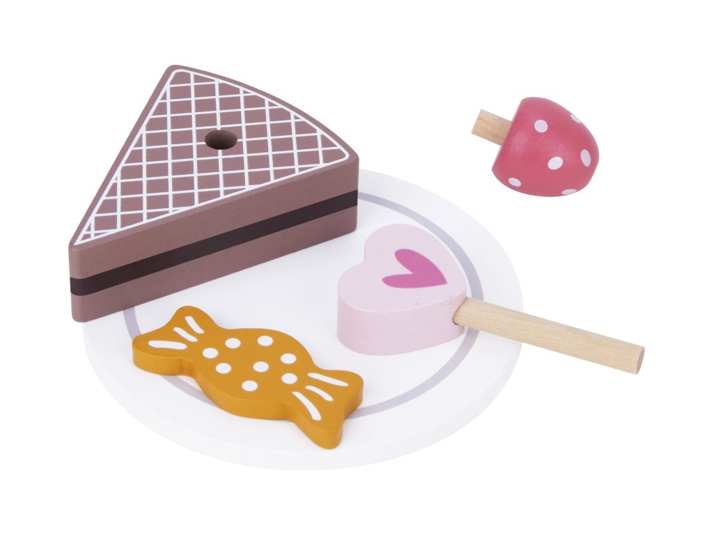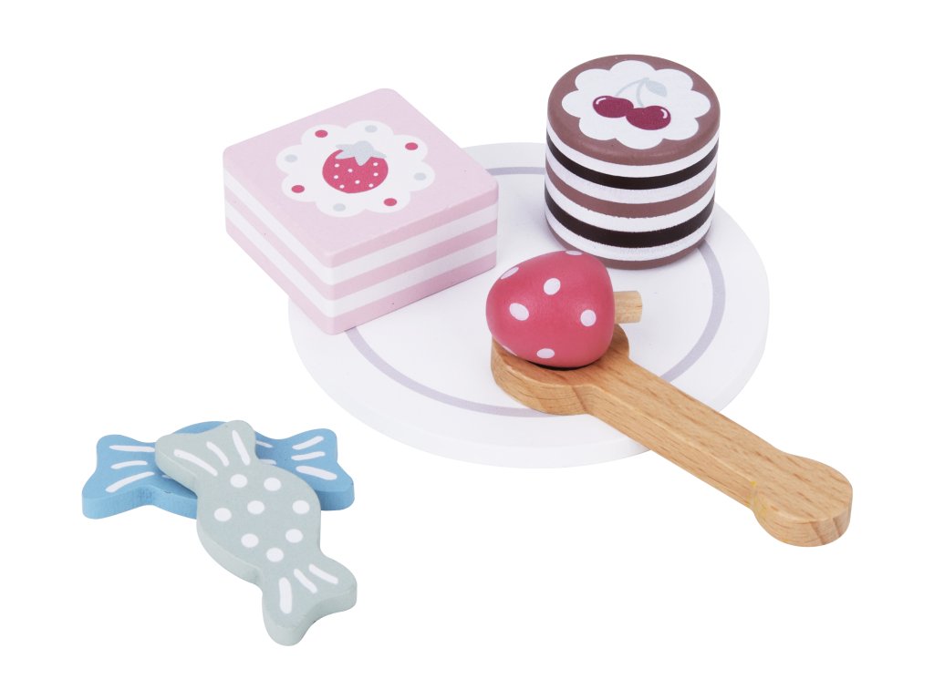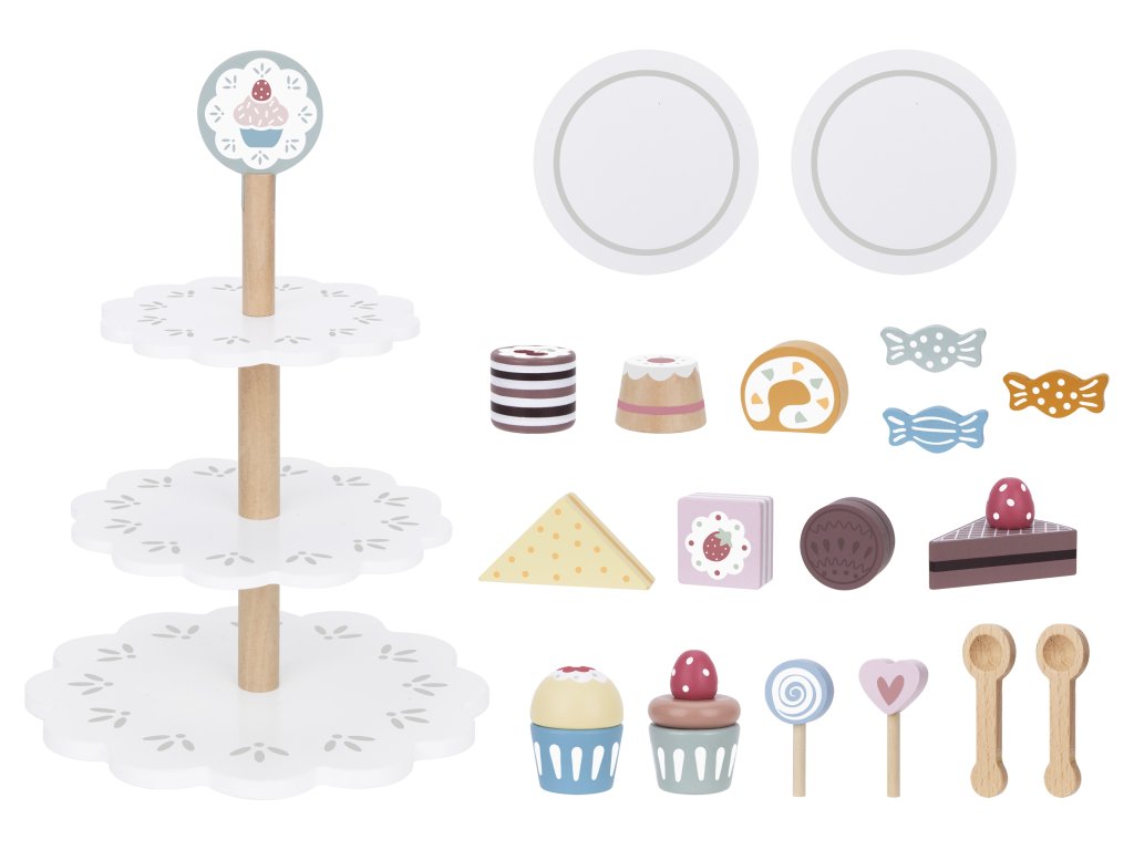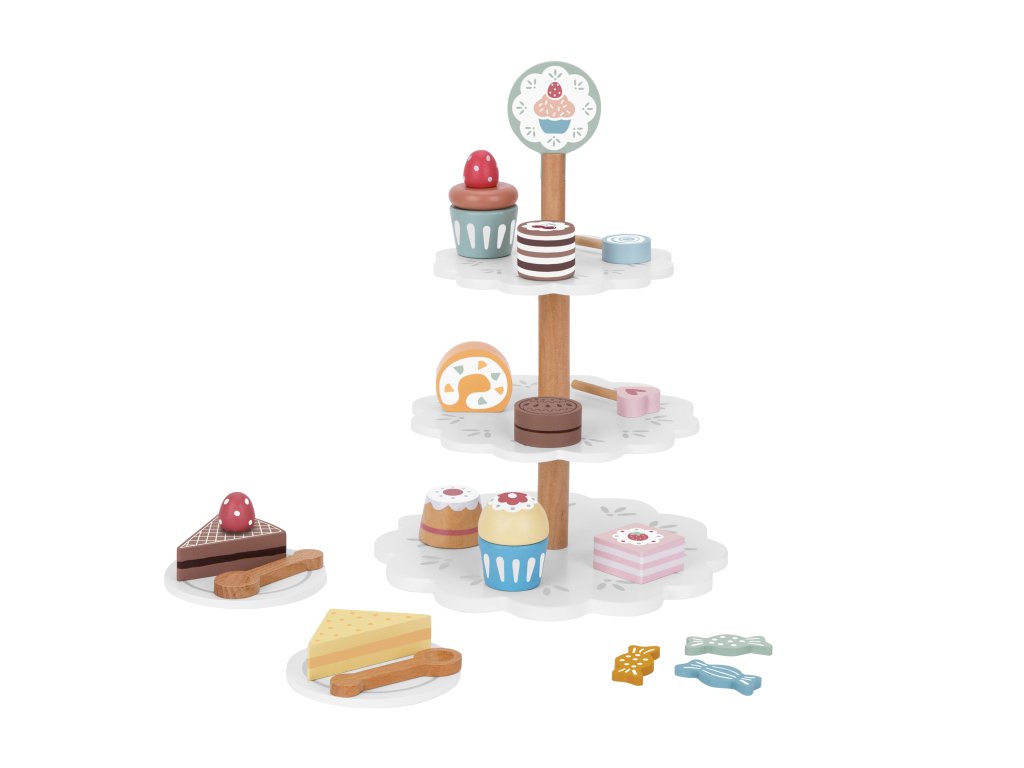 Pastel süteményállvány Készlet kis cukrászoknak A Tooky Toy gyermekeknek szánt, kihagyhatatlan fából készült tálaló süteményes állvány nagyszerű játék a felnőttek és a szakmák szerepjátékához. A masszív, háromszintes állvány (31 x 22 cm) gyönyörű kiegészítője lesz a gyerekszobának és a játékkonyhának is. A csomagban a tortaállványon kívül a gyerekek további 18 darab fából készült tortát és egyéb felszolgálókelléket találnak. Kanálak és tányérok is tartoznak a felszolgáláshoz.A gyermekek fejlesztik szociális készségeiket A fából készült, süteményes tálalóállvány a tartozékokkal a felnőttekkel való játék révén segíti a gyermekeket szociális készségeik és kommunikációjuk fejlesztésében. A gyerekek kreatívak a játékban, és pozitív kapcsolatot alakítanak ki az ételkészítéssel. A Tooky Toy gyermekeknek szánt fa játékok erős, jól megmunkált, fenntartható forrásból származó fából készültek, és nem mérgező festékekkel és lakkal vannak bevonva. A készlet nagyszerű ajándék 3 éves kortól.