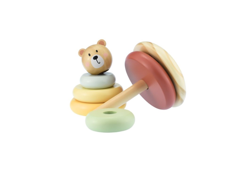 Mackó Pasztell Gyűrűk Végtelen gyűrűzés - garantált szórakozás A mackó mintájú színes torony tökéletesen gyakoroltatja a gyermek csuklóját, akinek az a feladata, hogy 5 pasztell színű gyűrűt helyezzen a rúdra. A gyermek mozgás közben ellazítja és elforgatja a csuklóját, ami alapot teremt a későbbi íráshoz. A játék ráadásul egyensúlyozó - kerek talppal rendelkezik, így a gyűrű felhelyezése türelmet és koncentrált szem-kéz koordinációt igényel.A játék ideális eszköz 1 éves gyermekek számára A gyermekek a finommotoros készségek fejlesztése mellett megtanulják felismerni az alapszíneket és tudatosítani a gyűrűk különböző méreteit.