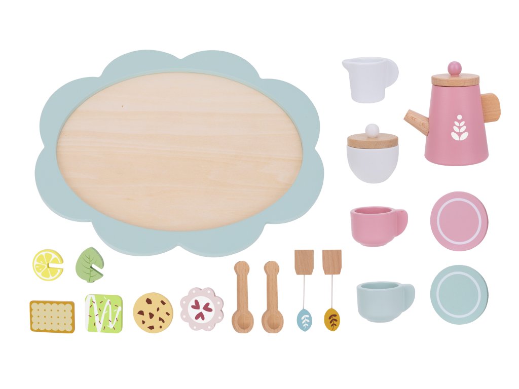 Pastell teáskészlet Szervezzen teázást! A Tooky Toy figyelemfelkeltő fa teáskészlete nagyszerű játék a felnőttek és a szakmák szerepjátékához. A minőségi teáskészlet gyönyörű kiegészítője lesz a gyerekszobának és a gyerekkonyhának. A gyerekek 20 darab fából készült teáskészletet és ételt találnak a tálaláshoz. Aranyos csészék és kanalak is tartoznak hozzá.A gyerekek fejlesztik a szociális készségeiket A pasztell színű fa teáskészlet segíti a gyerekeket a felnőttekkel való játék révén a szociális készségek és a kommunikáció fejlesztésében. A gyerekek kreatívak játék közben, és pozitív kapcsolatot alakítanak ki az italok és ételek elkészítésével és felszolgálásával. A Tooky Toy gyermekeknek szánt fa játékok erős, jól megmunkált, fenntartható forrásból származó fából készültek, és nem mérgező festékekkel és lakkal vannak bevonva. A készlet nagyszerű ajándék 3 éves kortól.