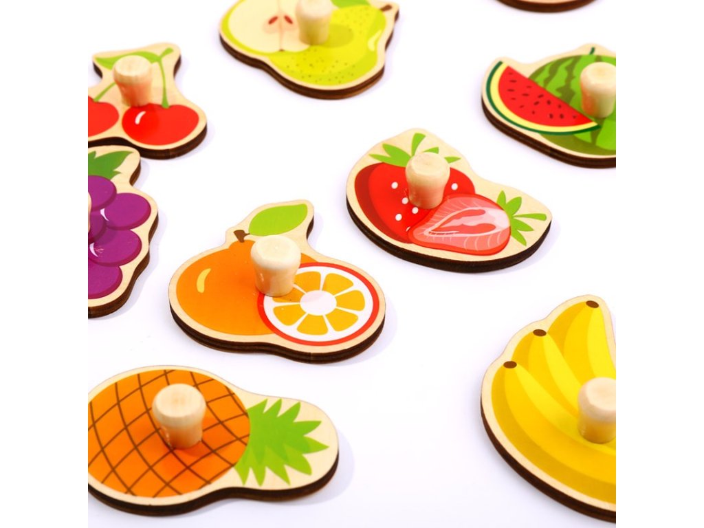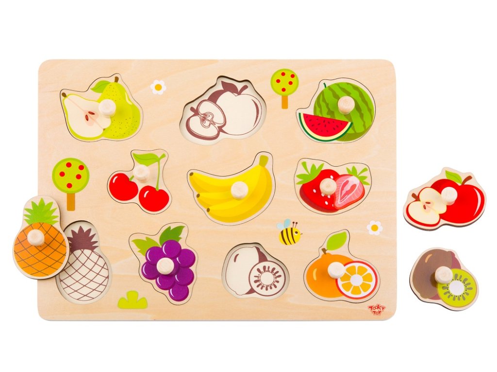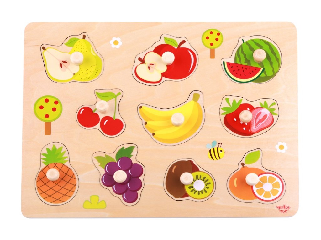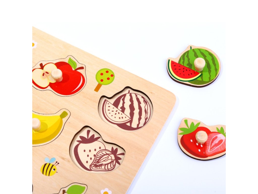 A tematikus puzzle tartalmaz egy alaplapot és 10 fa gyümölcsfajtát, például banánt, körtét, ananászt vagy almát. Tartós, fenntartható fából készült, kézzel festett vízbázisú festékekkel és formaldehidmentes ragasztóval rögzített.