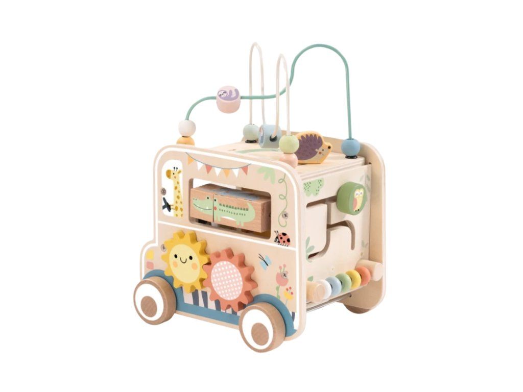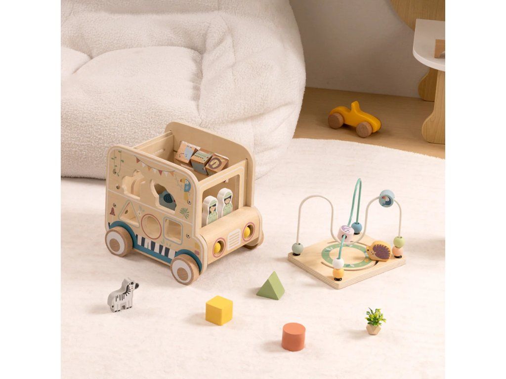 Szafari fából készült formabedobó labirintussalTöbbfunkciós fából készült készségfejlesztő játék a legkisebb felfedezőknekIndulj el egy szafari kalandra egyenesen a gyerekszobából! Ez a gyönyörű és színes, fából készült Szafari formabedobó labirintussal számos tevékenységet kínál a kisbabáknak és a kisebb gyerekeknek: figurák beillesztése, golyók mozgatása a labirintusban, fogaskerekek forgatása és pasztellszínű állatok felfedezése. A játékot úgy tervezték, hogy természetes módon támogassa a gyerekeket a formák, színek felismerésében és a motoros készségek fejlesztésében. Tanulás játékon keresztül – fejlődés minden mozdulattal Ez az aktivitás a szenzoros tanulást, a motoros készségeket és a képzeletet ötvözi az állatokkal teli világban. Segít a gyermekeknek fejleszteni: Finommotorikát és szem-kéz koordinációt, az alkatrészek és golyók mozgatásávalSzínek és formák felismerését, az alakzatok beillesztésével és az alkatrészek kezelésévelLogikai gondolkodást és problémamegoldást, a labirintuson való áthaladással és a fogaskerekek forgatásávalKépzeletet és kreativitást, miközben saját szafari történeteket alkotnakMiért fogják szeretni a gyerekek ezt a játékot?több tevékenység egy blokkban – beillesztés, labirintus, forgatás, manipulációkiváló minőségű fából készült, sima élekkel és biztonságos, nem mérgező színekkel ideális körülbelül 1-től 3 éves korig (a fejlődési szinttől függően)támogatja az önálló játékot és a családi bevonódástnagyszerű ajándék a kis felfedezőknek, akik szeretik az állatokat és az interaktív játékot