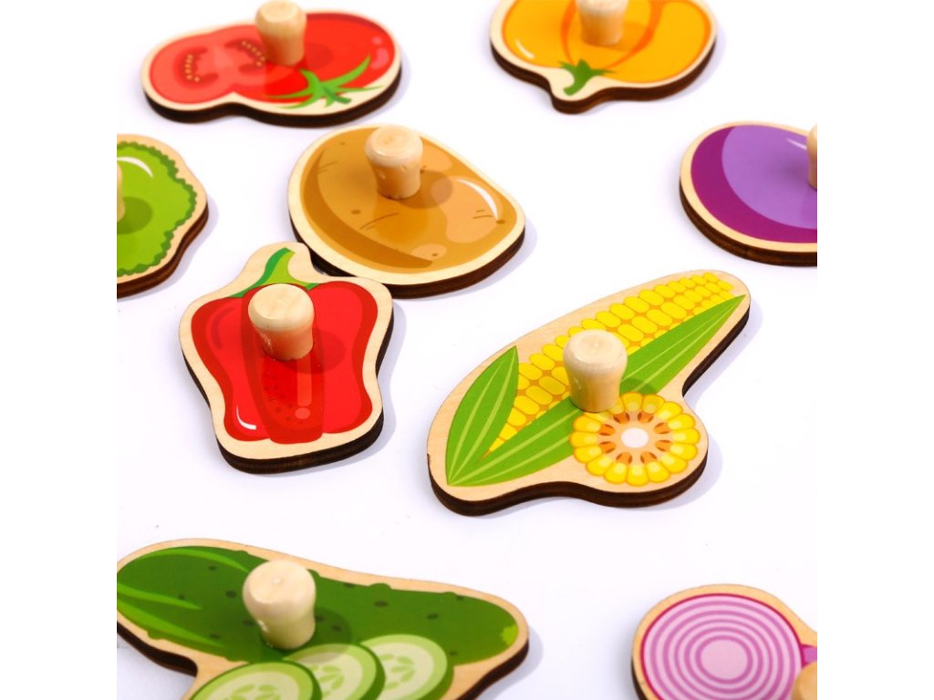 Zöldség berakó puzzle A gyerekek megtanulják a különböző zöldségeket. A tematikus puzzle tartalmaz egy alaplapot és 10 fából készült zöldségfélét, például paradicsomot, sárgarépát, brokkolit vagy burgonyát. Tartós, fenntartható fából készült, kézzel festett vízbázisú festékekkel és formaldehidmentes ragasztóval rögzített.A beillesztő puzzle fejleszti a finommotorikát. Javítja a szem-kéz koordinációt, a türelmet és az önálló játék képességét is. A nagy, fogantyús daraboknak köszönhetően már 18 hónapos kortól alkalmas a gyermekek számára.