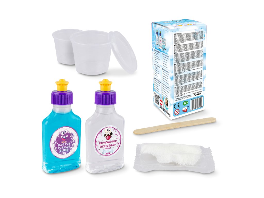 DIY Slime készlet felhő nyálka készítéséhez Készítsd el saját felhőszerű, bolyhos nyálkádat Nagyszerű tevékenység a kísérletezni szerető gyermekek számára. Ebben a készletben mindent megtalálsz, ami a minőségi slime elkészítéséhez szükséges. A speciális összetevőnek - a műhónak - köszönhetően a nyálka hihetetlenül finom és bolyhos lesz, és egy felhőcskére fog emlékeztetni. A slime-mal való játék ideális a finommotoros készségek, az érzékszervi érzékelés fejlesztésére, és támogatja a gyermekek kreativitását.A készlet tartalma: 100 ml kék PVA ragasztó, 100 ml aktivátor, 2 g műhó, spatula, tartály.Szórakoztató, oktató és pihentető A nyálkával való manipuláció nyugtató és pihentető lehet a gyermekek számára. Ez egy nagyszerű módja annak, hogy pihenjen és csökkentse a stresszt egy nehéz nap után. Fedezze fel az összes DIY slime-ot és a kész Jiggly slime-okat különböző színekben és illatokban.A slime biztonságos és nem mérgező anyagokból készül, amelyek környezetbarátak és nem tartalmaznak bóraxot. Játék után javasoljuk, hogy a slime-ot a mellékelt tartályban tárolja és jól zárja le.A szenzoros játék lehetővé teszi a gyermekek számára, hogy érzékszerveik révén fedezzék fel a körülöttük lévő világot A különböző textúrákkal, színekkel és illatokkal való játék nemcsak érzékszervi érzékelésüket serkenti, hanem támogatja kognitív fejlődésüket, finommotorikájukat és érzelmi intelligenciájukat is. A Tuban termékeivel a gyermekek különféle szenzoros ingereket fedezhetnek fel, és új tanulási és szórakozási módokat fedezhetnek fel.