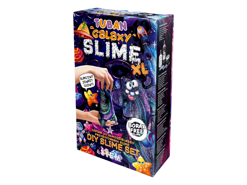 DIY Slime Szett galaktikus nyálka készítéséhez XL XL szett még nagyobb mennyiségű galaktikus galaxis nyálkához Nagyszerű tevékenység a kísérletezni szerető gyermekek számára. Ebben a készletben mindent megtalálsz, ami a minőségi slime elkészítéséhez szükséges. Minden még nagyobb mennyiségben! Használd a készletet több gyermekkel való játékhoz, vagy készíts slime-ot többször is. A kék csillámoknak és a lila pollennek köszönhetően a fekete nyálka úgy fog kinézni, mint egy igazi galaxis tele apró csillagokkal. A slime-mal való játék ideális a finommotoros készségek, az érzékszervi érzékelés fejlesztésére, és támogatja a gyermekek kreativitását.A készlet tartalma: 500 ml fekete PVA ragasztó, 250 ml aktivátor, 1,5 g kék csillám, 1,5 g lila pollen, spatula, mérőpohár, edény.Szórakoztató, oktató és pihentető A nyálkával való manipuláció nyugtató és pihentető lehet a gyermekek számára. Ez egy nagyszerű módja annak, hogy pihenjen és csökkentse a stresszt egy nehéz nap után. Fedezze fel az összes DIY slime-ot és a kész Jiggly slime-okat különböző színekben és illatokban.A slime biztonságos és nem mérgező anyagokból készül, amelyek környezetbarátak és nem tartalmaznak bóraxot. Játék után javasoljuk, hogy a slime-ot a mellékelt tartályban tárolja és jól zárja le.A szenzoros játék lehetővé teszi a gyermekek számára, hogy érzékszerveik révén fedezzék fel a körülöttük lévő világot A különböző textúrákkal, színekkel és illatokkal való játék nemcsak érzékszervi érzékelésüket serkenti, hanem támogatja kognitív fejlődésüket, finommotorikájukat és érzelmi intelligenciájukat is. A Tuban termékeivel a gyermekek különféle szenzoros ingereket fedezhetnek fel, és új tanulási és szórakozási módokat fedezhetnek fel.