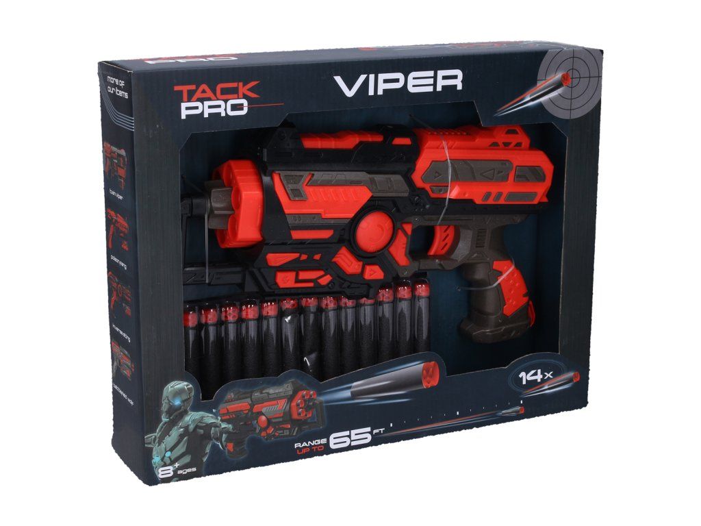 Viper habarcsöves pisztoly. Mérete 32 x 7 x 17 cm. A csomag egy pisztolyt és 14 töltényt tartalmaz. A pisztoly oldalán található nagy gomb kioldja a tárat. A 6 töltényes tár a pisztoly csövébe helyezhető. Töltés meghúzással. Csomag méretei: 39 x 30 x 8 cm. Életkor: 8+