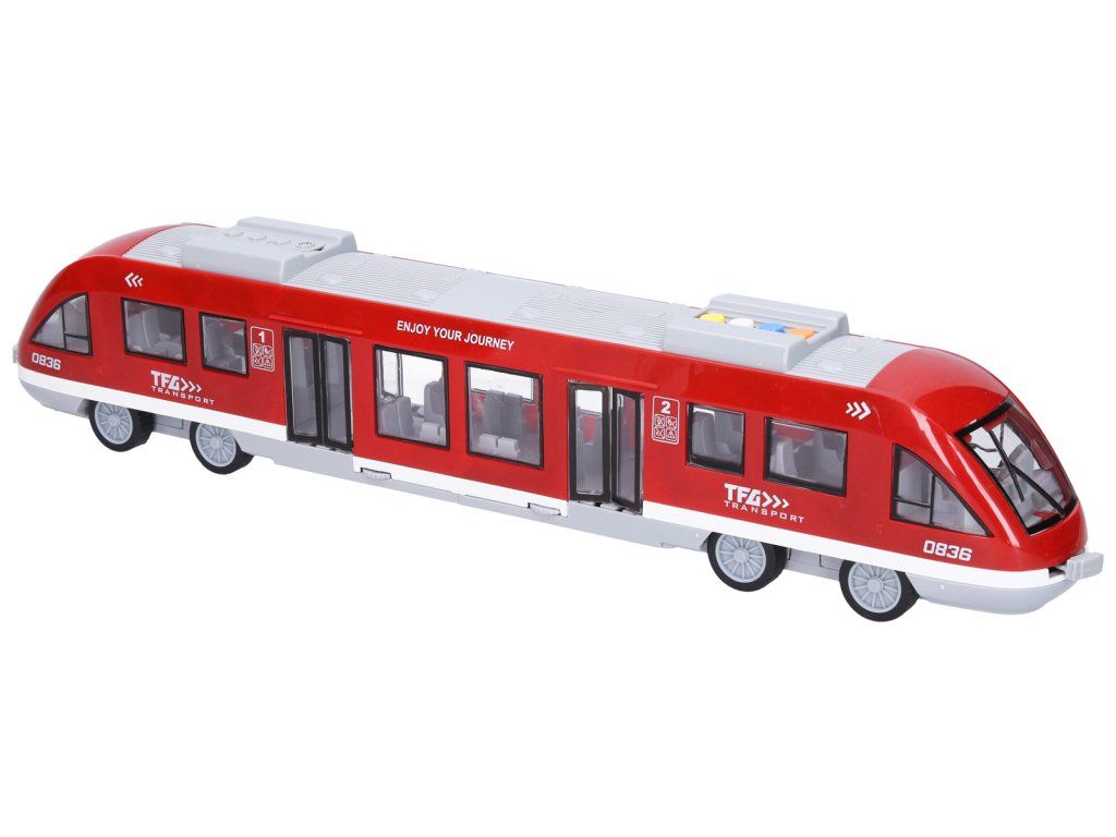 Vonat lendkerékkel. Mérete: 44,5 x 5,8 x 9 cm. Fény- és hanghatások, aktiválás a tetőn lévő gombokkal. Az elem 3 x AG13-at tartalmaz. Csomag méretei: 48 x 16,5 x 11 cm. Életkor: 3+