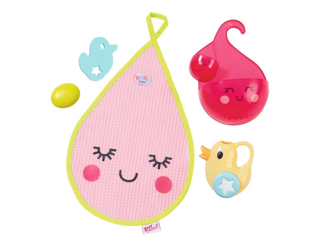 Cáky-cák, a fürdés nagyon szórakoztató. Különösen a BABY born fürdőszobai kiegészítőkészletével. A készlet tartalmaz egy Berta kacsa alakú kannát, egy kacsa alakú szivacsot, egy limezöld szappant, egy csepp alakú törölközőt és egy szappantartót / kis víztartályt nagy víztartállyal. Próbálj meg saját vízesést létrehozni! Először töltsd meg a kannát vízzel, majd öntsd a vizet a felső tartályba, majd fokozatosan öntsd át az alsó tartályba, végül a kádba. És játék után mindent szépen megszáríthatsz a csepp alakú törölközővel. Eredeti kiegészítő a BABY born babákhoz. A gondosan megtervezett kiegészítők fejlesztik a gyermekek képzelőerejét, és új lehetőségeket és játéktémákat nyitnak meg. BABY born Fürdőszobai kiegészítők víztartályokkal, kannával, szivaccsal, szappannal és törölközővel