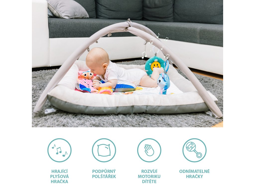 A játékok könnyen levehetők a játékívről, és rögzíthetők a babakocsira, az autósülésre vagy a formázott tartópárnára. Ez támaszt nyújt a hasi fekvés gyakorlásához.