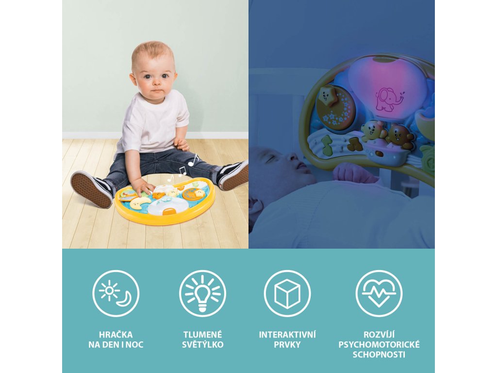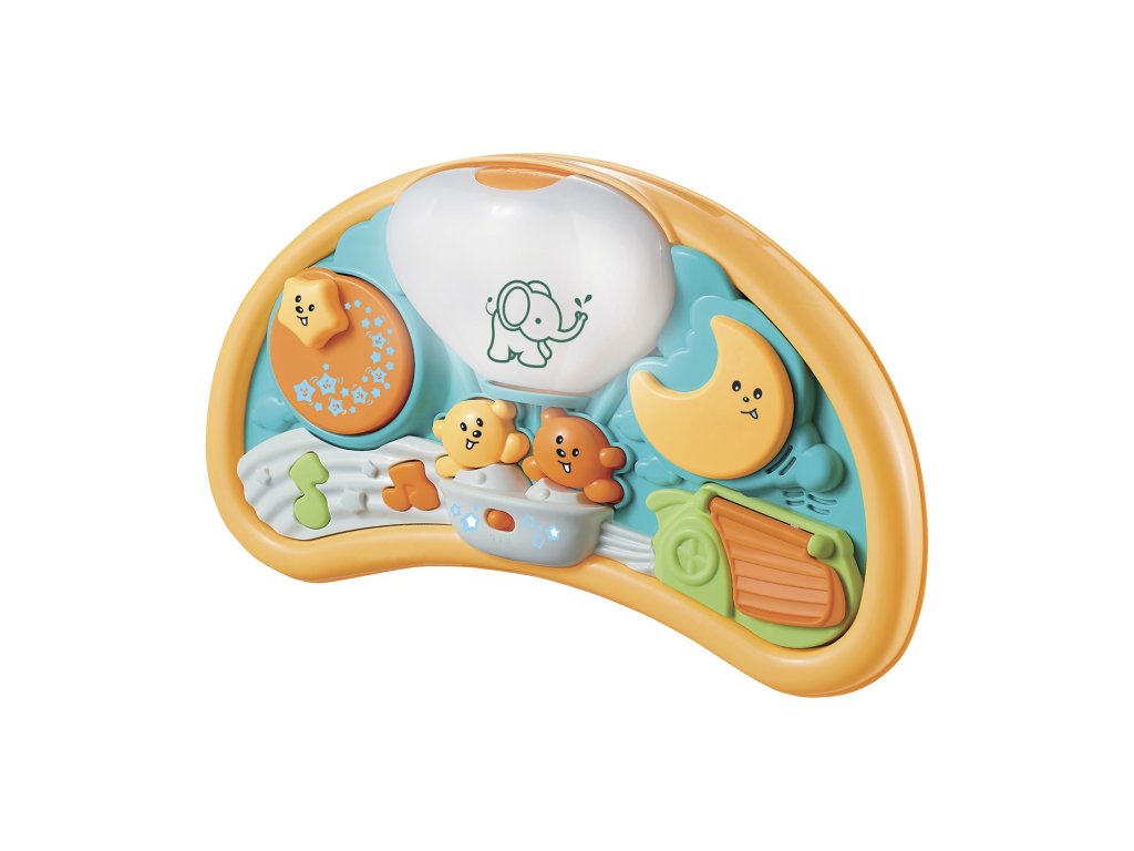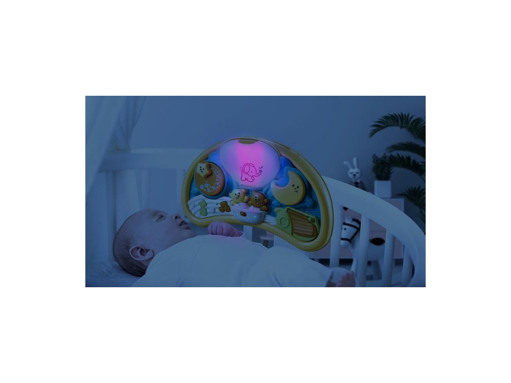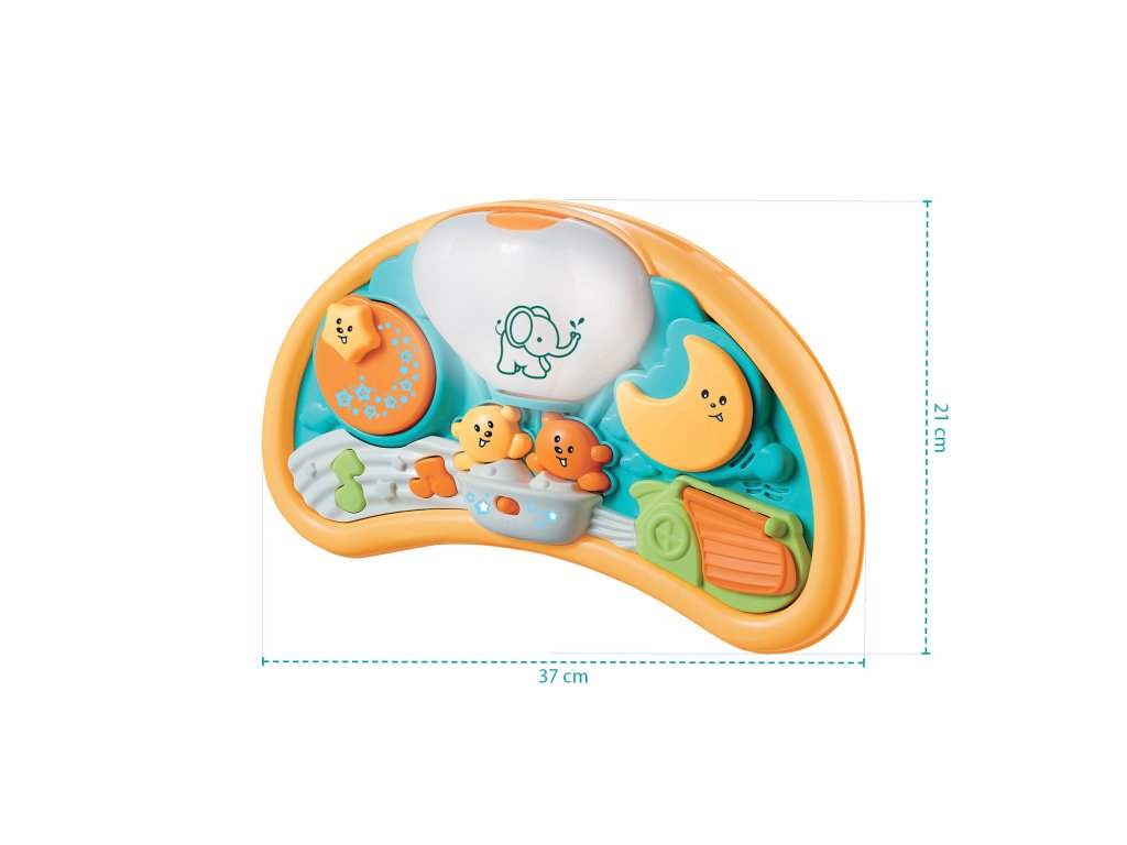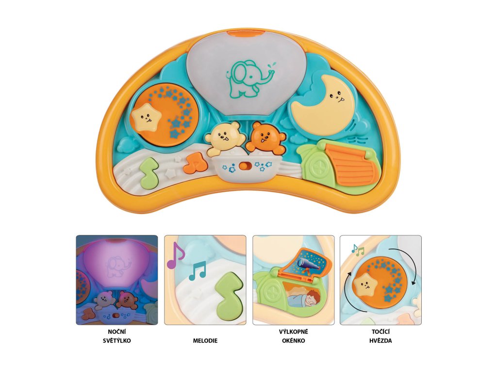 Aranyos, interaktív játék, amely hosszú órákra leköti a gyermeket. A minőségi műanyagból készült hold alakú tábla gombokkal rendelkezik, macikkal, csillagokkal és holddal. A gombok megnyomásakor dallamokat játszanak, a táblán lévő elemek forgathatók és különféleképpen nyithatók. A játék fejleszti a fantáziát és a pszichomotoros készségeket. Éjszaka a játék tompított éjszakai fényként szolgál, amely segít a gyermeknek leküzdeni a sötétségtől való félelmet.
