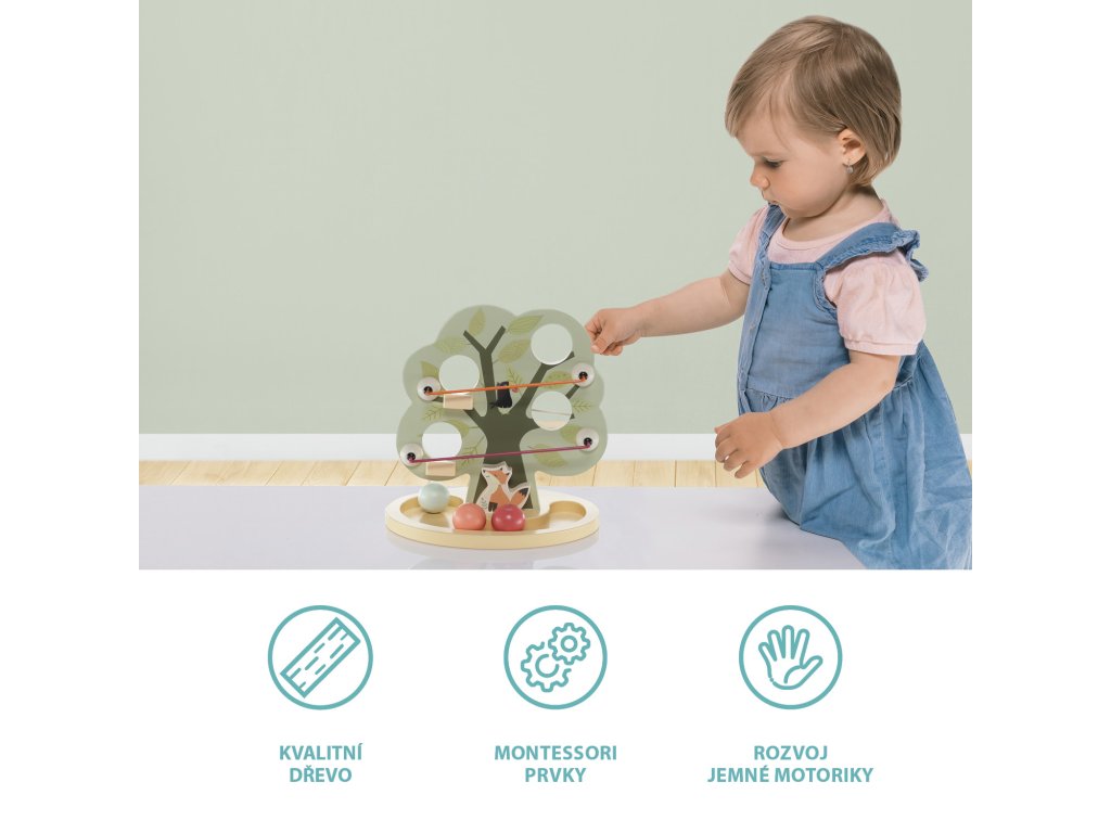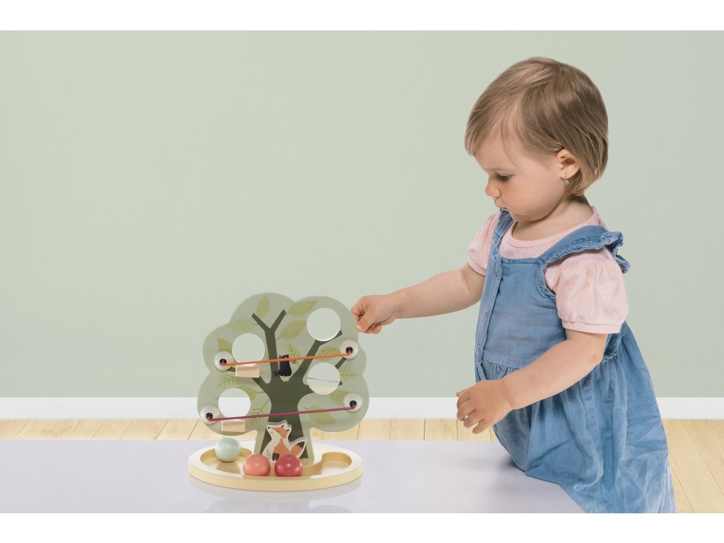 Aranyos fa játék egy fa formájában, több lyukkal a labdák átdobására. Az alsó részén lévő horony felfogja a labdákat, így a gyermek követheti azok esését. A játék fejleszti a képzelőerőt, a gondolkodást és a kéz koordinációját.