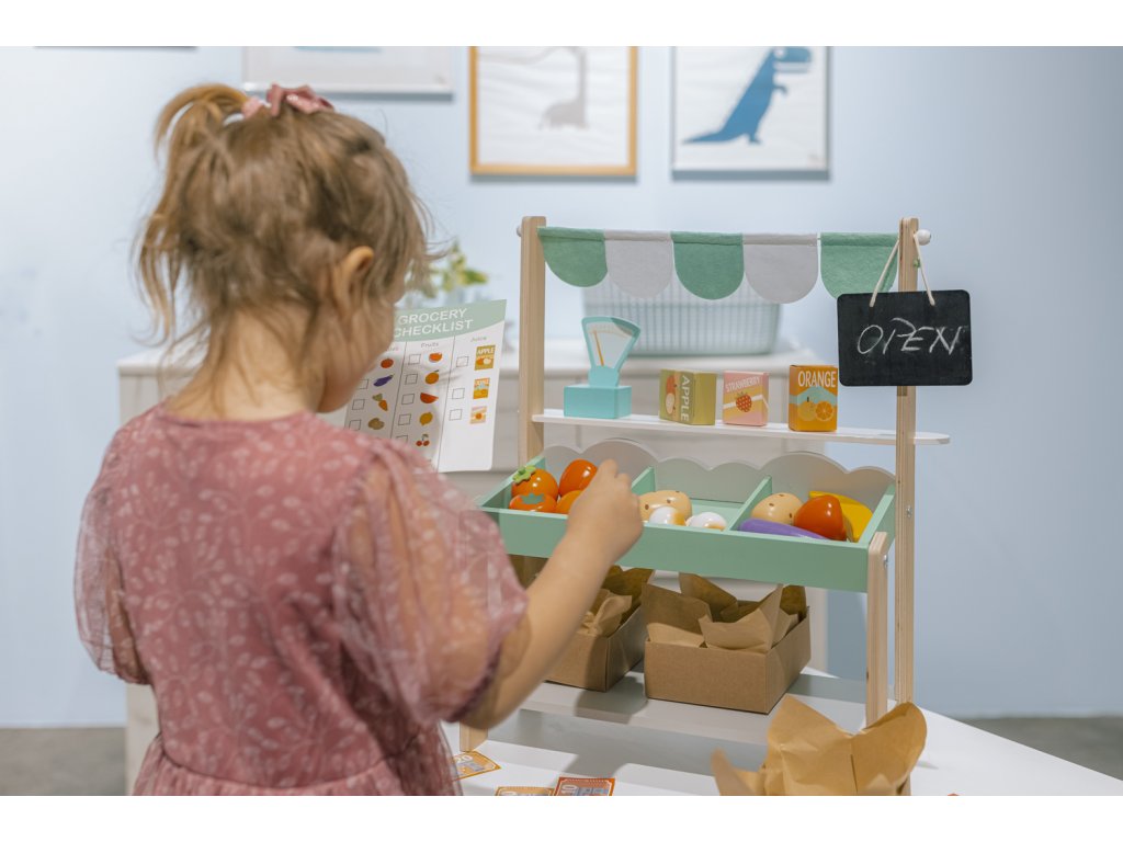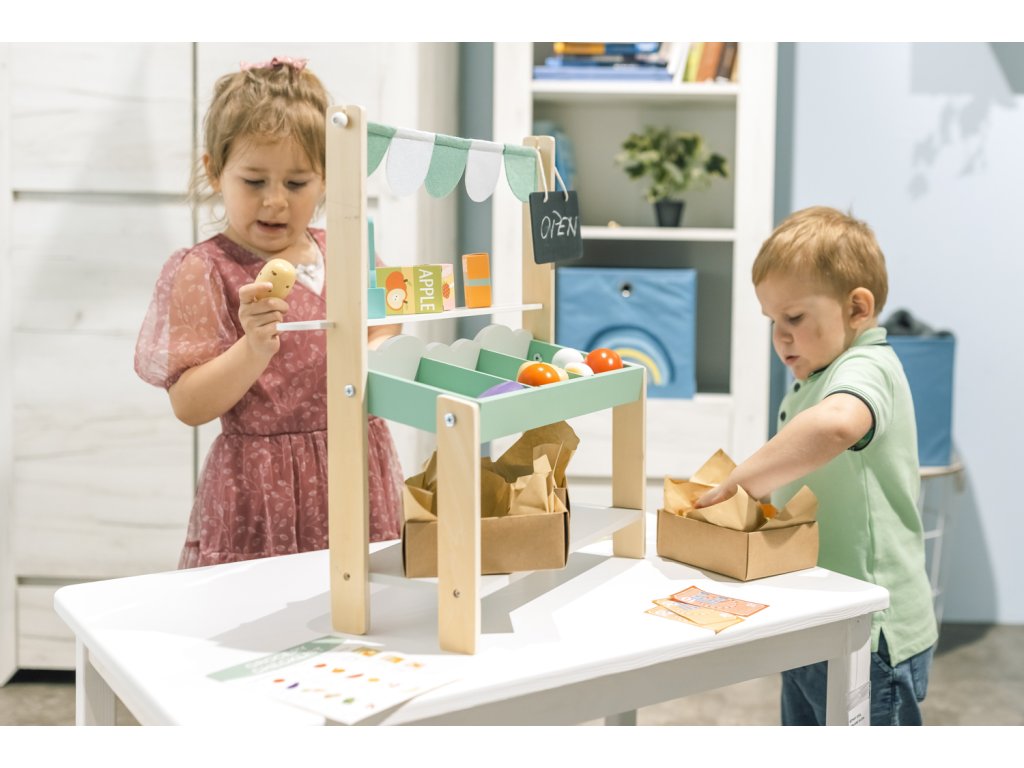 Gyermekei létrehozhatnak egy saját piacot a nappaliban vagy a teraszon, ahol bővíthetik kínálatukat kedvenc fa játékaikkal és finomságaikkal.