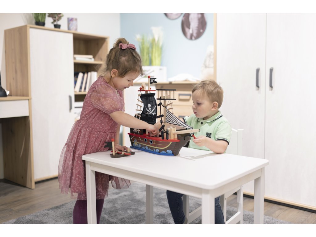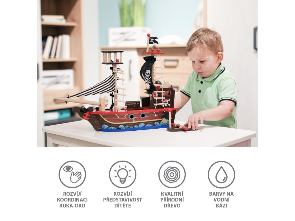 A kalózhajó támogatja a finommotoros készségek, a képzelőerő és a fantázia fejlődését. A játék során szükséges kéz-szem koordinációnak köszönhetően erősödik a kommunikációs képessége és az önbizalma. Ezzel a hajóval a gyermek mindent megtalál a csomagban, ami a kalózokkal való kalandos játékhoz szükséges.