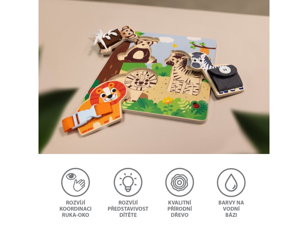 A tartós fa elemeknek köszönhetően ezek a puzzle-k úgy készültek, hogy végtelen órákon át tartó szórakozást nyújtsanak, a nem mérgező festékek használatának köszönhetően pedig teljesen biztonságosak a gyermekek számára. A kirakós játékok szintén segítik a finommotoros készségek és a szem-kéz koordináció fejlesztését, mindezt egy szórakoztató és oktató játékon keresztül. A Montessori elemek, mint a csat, a gombos zseb és a fűzők, segítik a tanulást.
