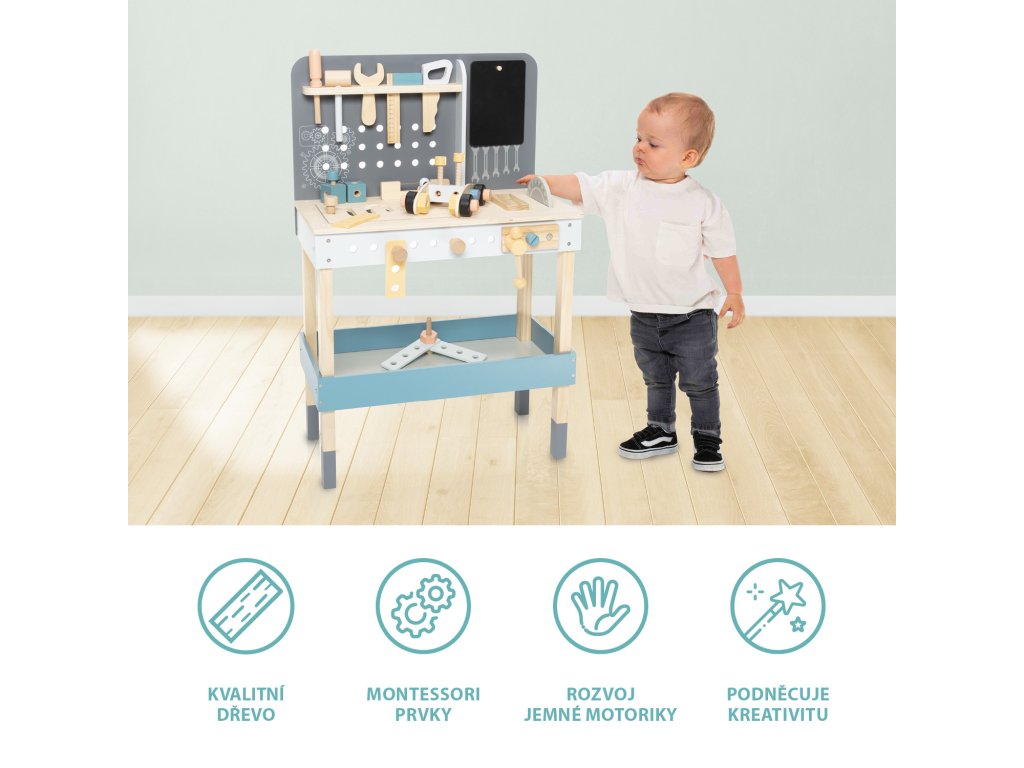 Tágas munkapad, amely nem hiányozhat egyetlen gyerekműhelyből sem. A munkapad egy nagy, kör alakú asztallapot tartalmaz különféle alkatrészekkel - a fa deszkáktól a csavarokon át az anyákig. Az asztallap alatt tárolóhely található. Tartalmaz egy polcot is lyukakkal a fa kalapács, a mérőszalag és a fűrész felakasztásához. A munkapad minőségi fából és vízbázisú festékekből készült. Fejleszti a motoros készségeket és a képzelőerőt.