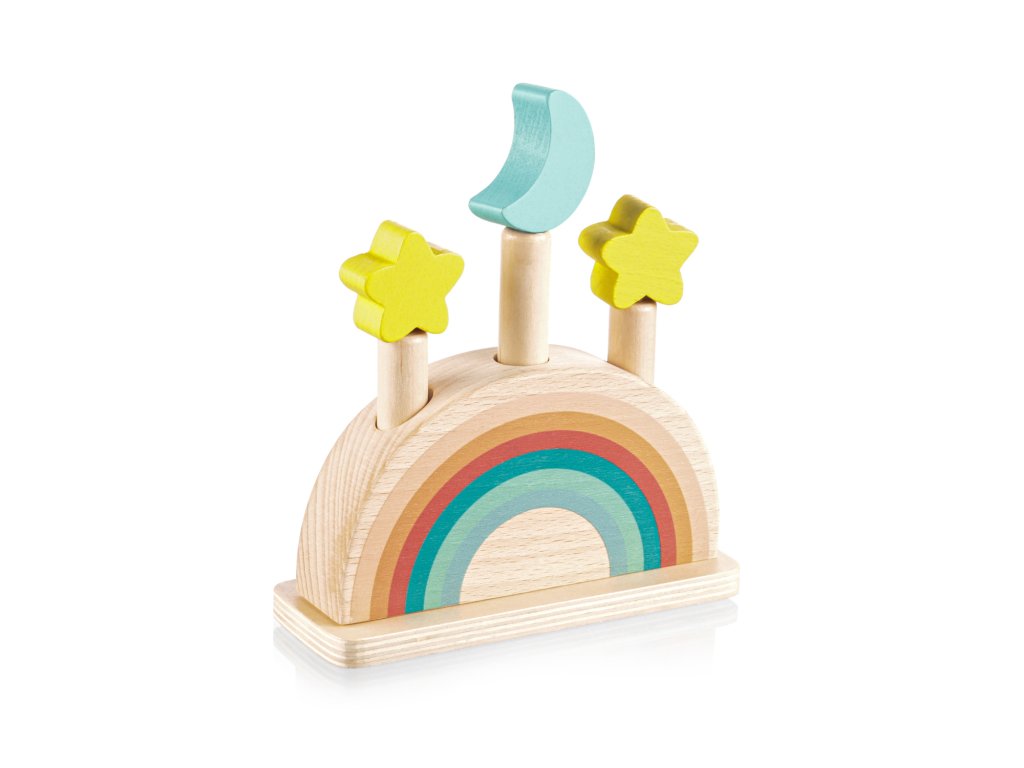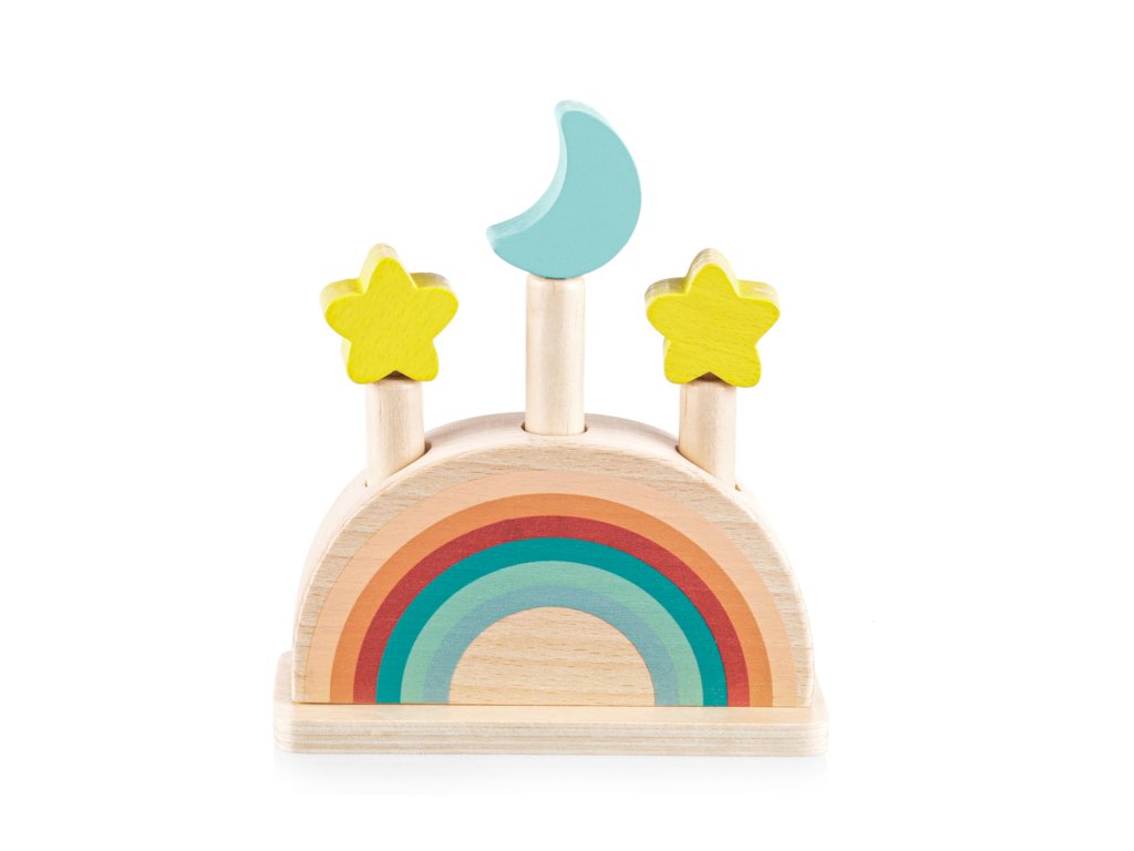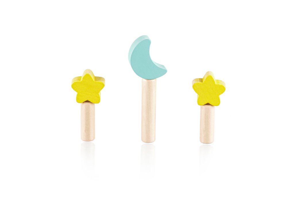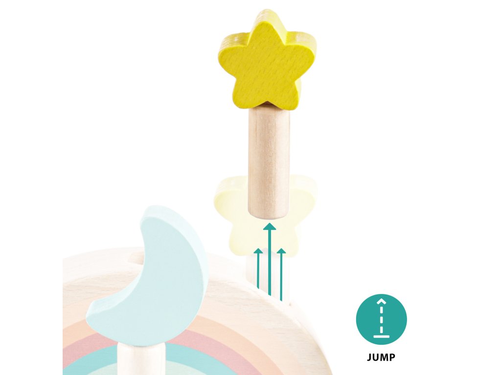 Szórakoztassa gyermekét órákon át ezzel a felugró fa játékkal. Három színes, hold és csillag motívumú csap rögzítve van egy fa alapban rugókkal. Amikor ezeket a csapokat finoman megnyomja, kioldódnak, és a rugó felugrasztja őket. A játék fejleszti a motoros készségeket, a koordinációt és a koncentrációt, így ideális a korai tanuláshoz. Természetes bükkfából készült.