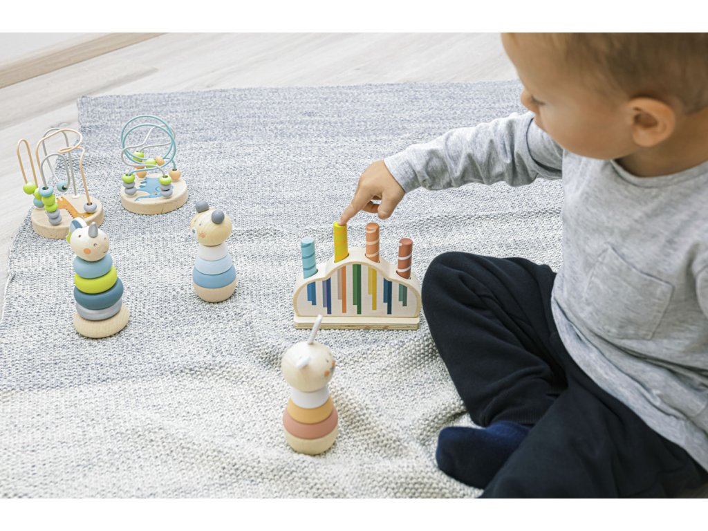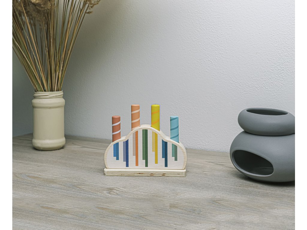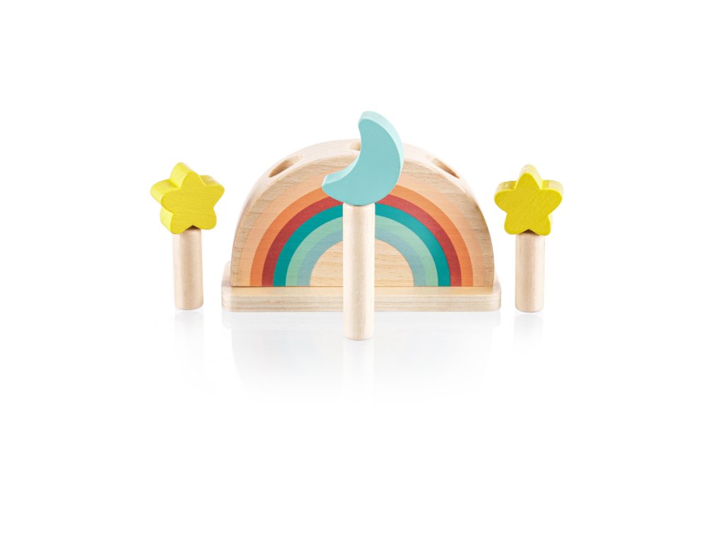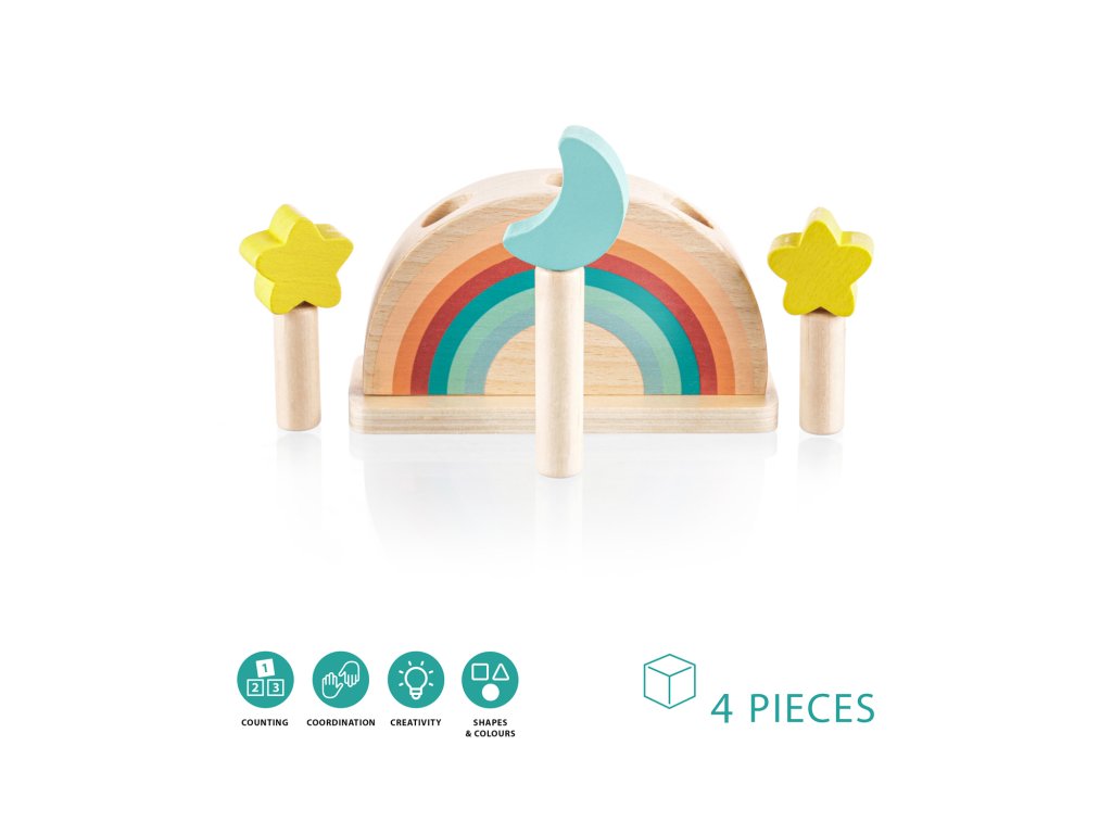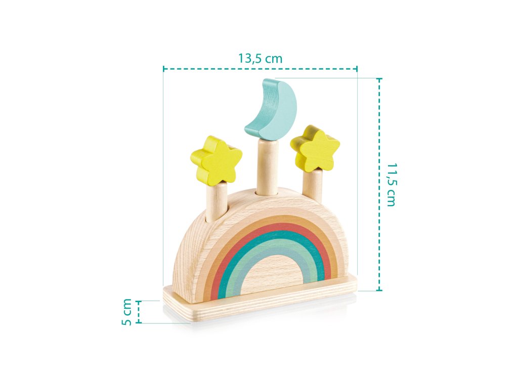 Szórakoztassa gyermekét órákon át ezzel a felugró fa játékkal. Három színes, hold és csillag motívumú csap rögzítve van egy fa alapban rugókkal. Amikor ezeket a csapokat finoman megnyomja, kioldódnak, és a rugó felugrasztja őket. A játék fejleszti a motoros készségeket, a koordinációt és a koncentrációt, így ideális a korai tanuláshoz. Természetes bükkfából készült.