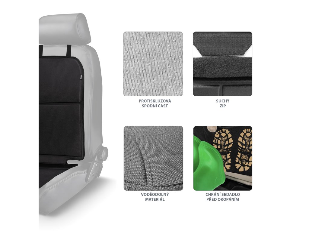A védelem, amely lefedi az autóülés teljes felületét, megakadályozza annak szennyeződését, és a csúszásgátló felületnek köszönhetően szilárdan a helyén tartja a gyermekülést. A védelem formázott alsó résszel rendelkezik, így az autóülés valóban jól el van szigetelve az esetleges szennyeződésektől.