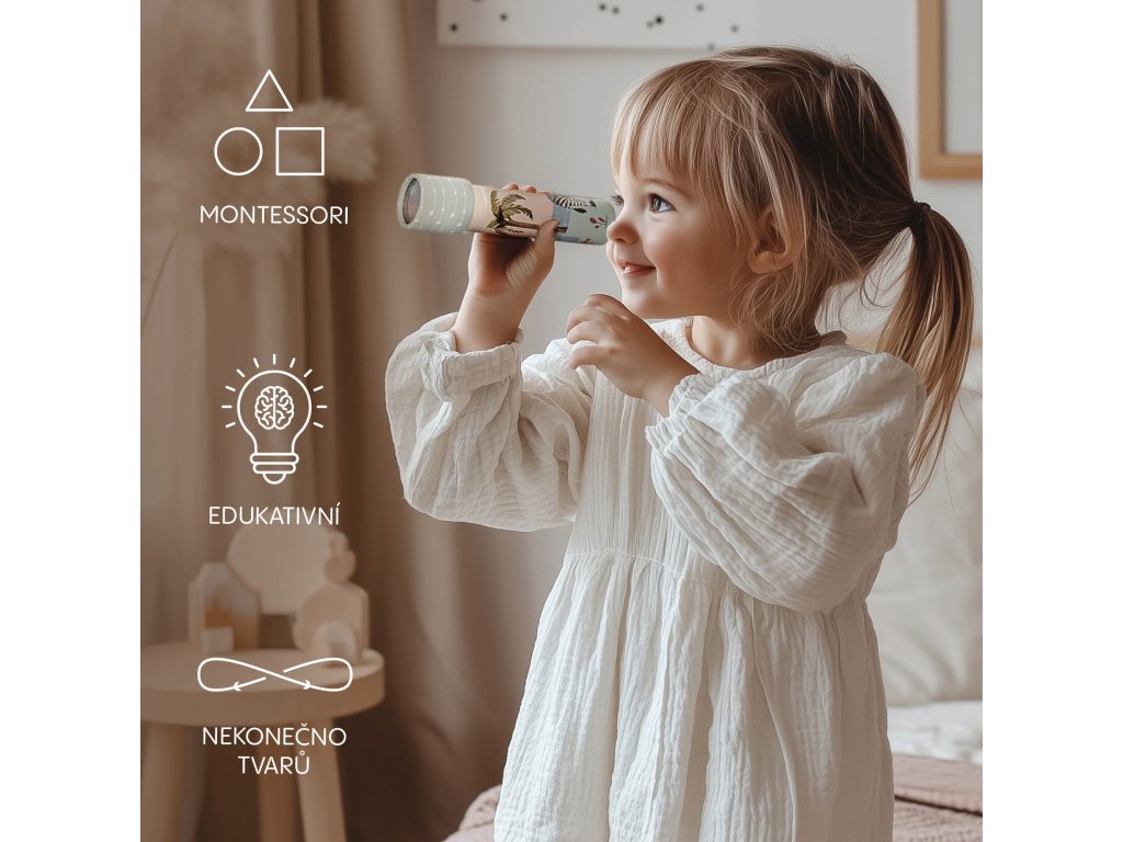 A színes, természet- és állatillusztrációkkal díszített kaleidoszkóp minden kíváncsi gyermeket elvarázsol. Első pillantásra elbűvöl kedves dizájnjával, de a valódi varázslat belül zajlik – minden forgatással a színek és formák végtelen kombinációja jön létre. Ez a klasszikus játék ideális eszköz a montessori pedagógia szellemében, amely serkenti az érzékeket, támogatja a kreativitást és jelentős oktatási haszonnal jár.