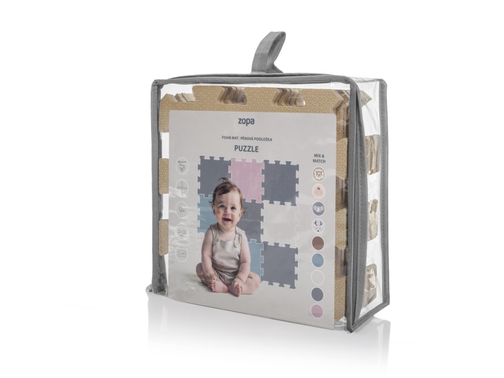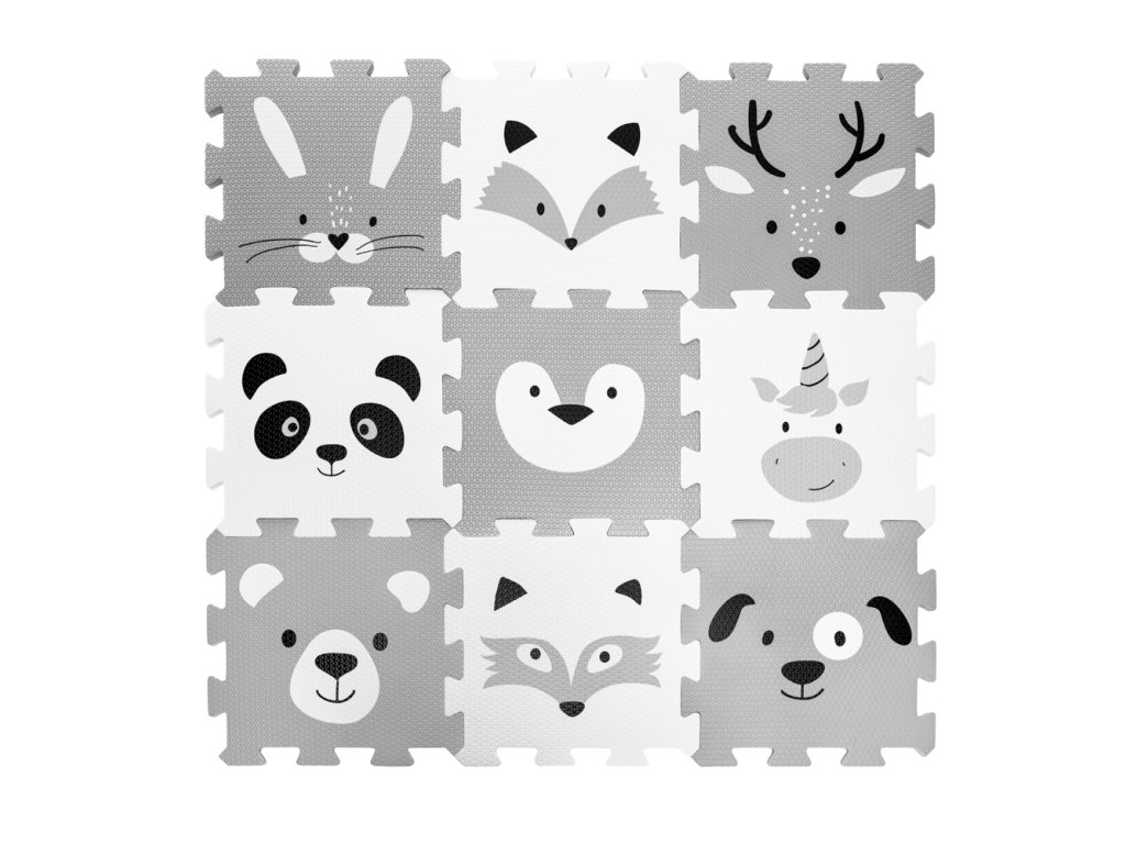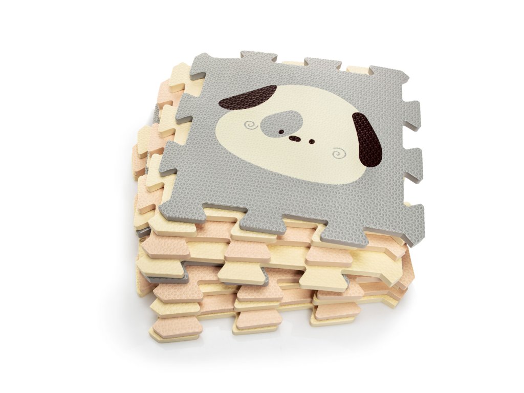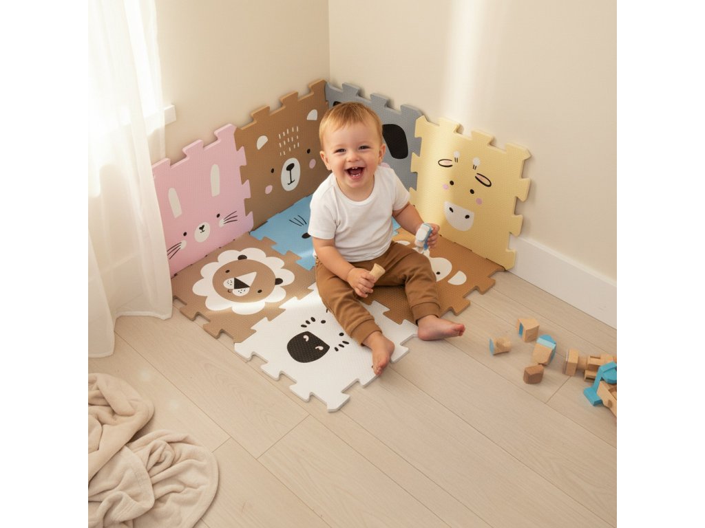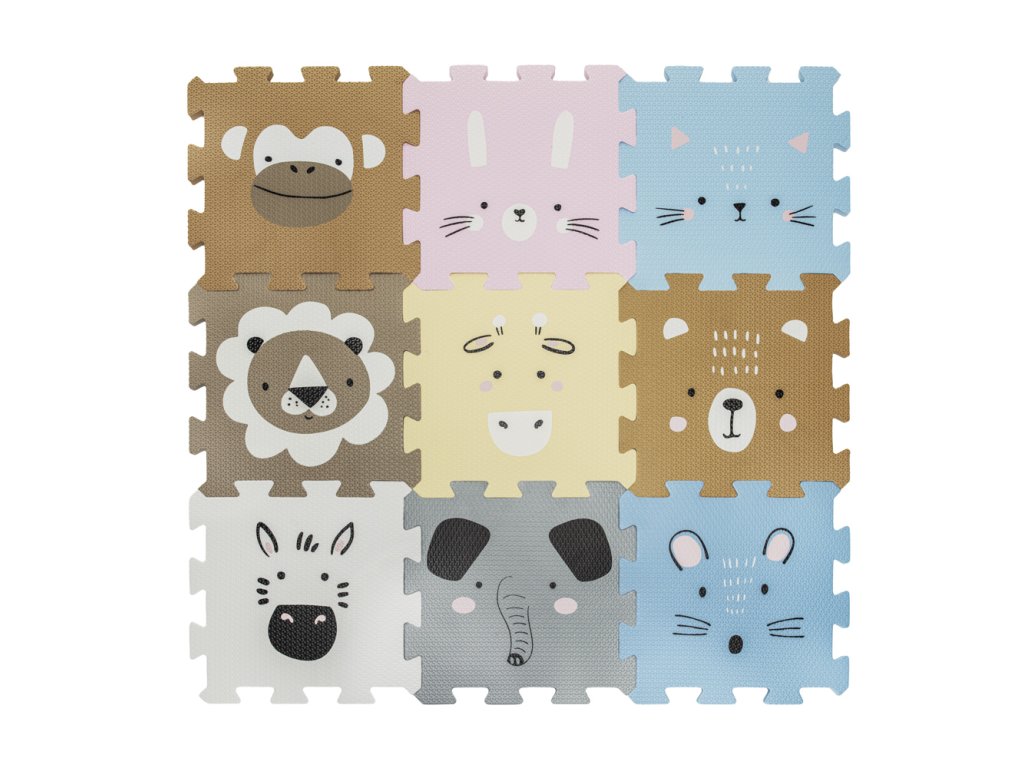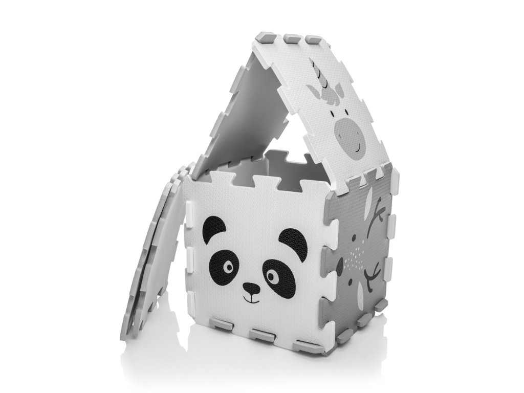 Az egyes 30 × 30 cm-es lapok (9 db) tökéletesen illeszkednek egymáshoz. Az alátét születéstől kezdve alkalmas gyermekek számára, ártalmatlan és kellemes anyagból készült.