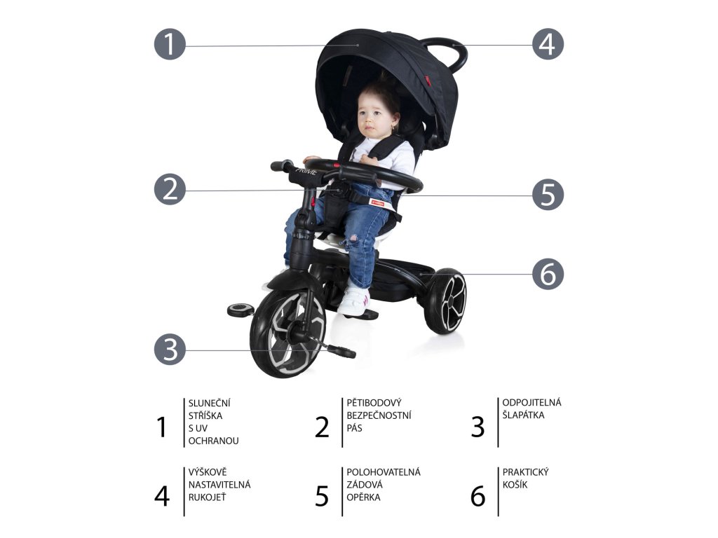 Ahogy a gyermek növekszik, és az Ön igényei változnak, a Prime tricikli 4 használati módot kínál. Az 1. módban a gyermek a szülő felé néz, a pedálok és a kormány le vannak választva. A 2. módban a gyermek éppen ellenkezőleg, a szülőtől elfelé néz, miközben a pedálok és a kormány még mindig le vannak választva. A 3. mód azt kínálja, hogy a gyermek a szülőtől elfelé ül, a pedálok és a kormány be vannak kapcsolva a gyermek aktív mozgásának lehetőségével. Az utolsó – 4. módban a gyermek fordítva ül, a szülőtől elfelé, a pedálok és a kormány be vannak kapcsolva. A szülő már nem irányítja a triciklit, a vezetőrúd eltávolításra kerül, és a gyermek teljesen egyedül megy.