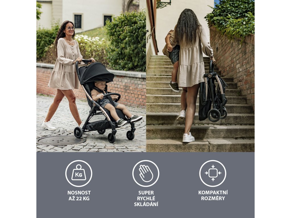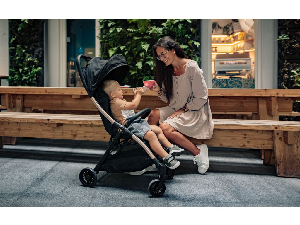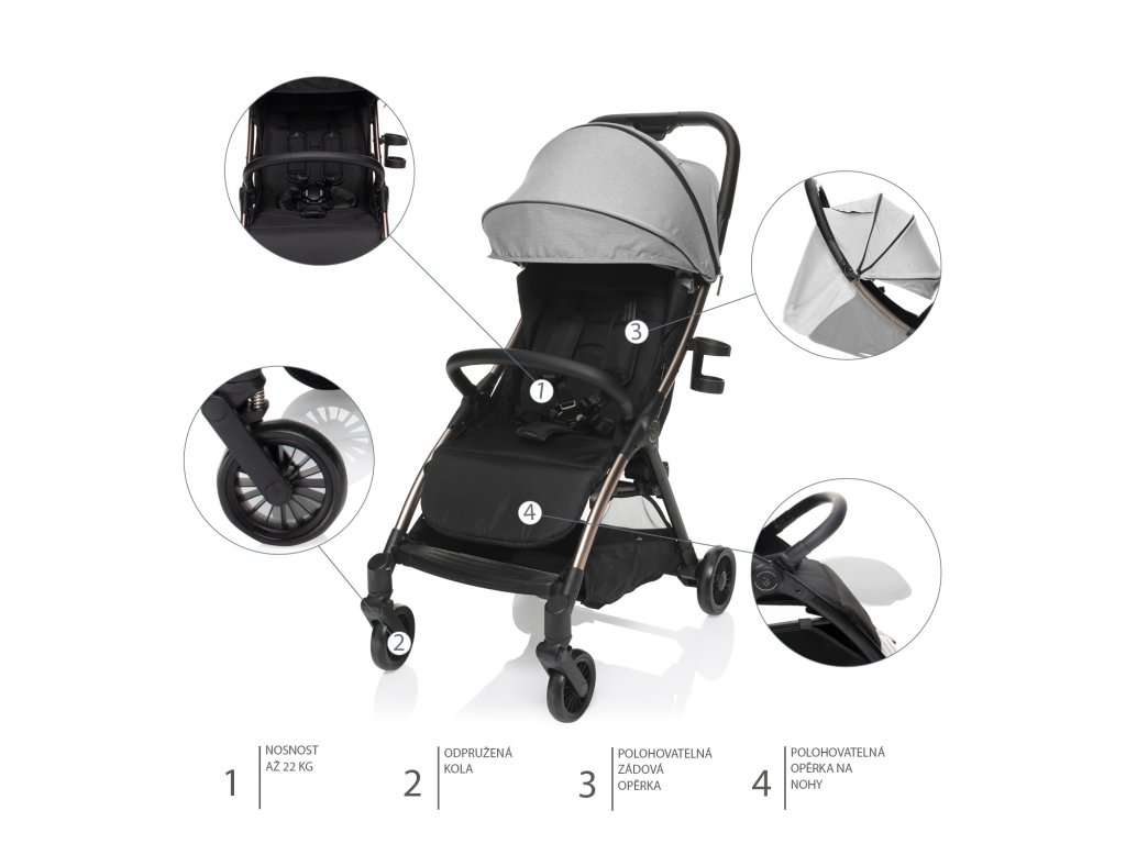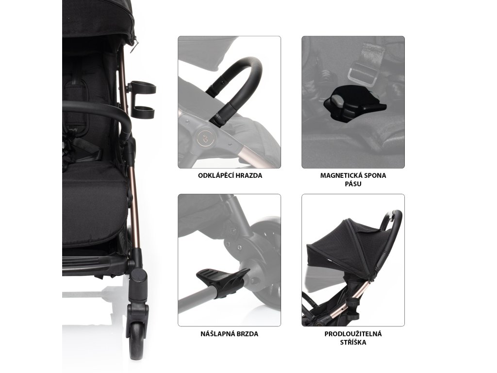 A puha sportülés 5 pontos biztonsági övvel és mágneses csattal van felszerelve. A babakocsi korlátja lehajtható, hogy a gyermek könnyebben leülhessen. A bővíthető tető szellőzőablakkal védi a gyermeket a naptól és a széltől. A csomag tartalmaz egy kosarat is, amely akár 3 kg-nyi, utazáshoz szükséges tárgyat is elbír.