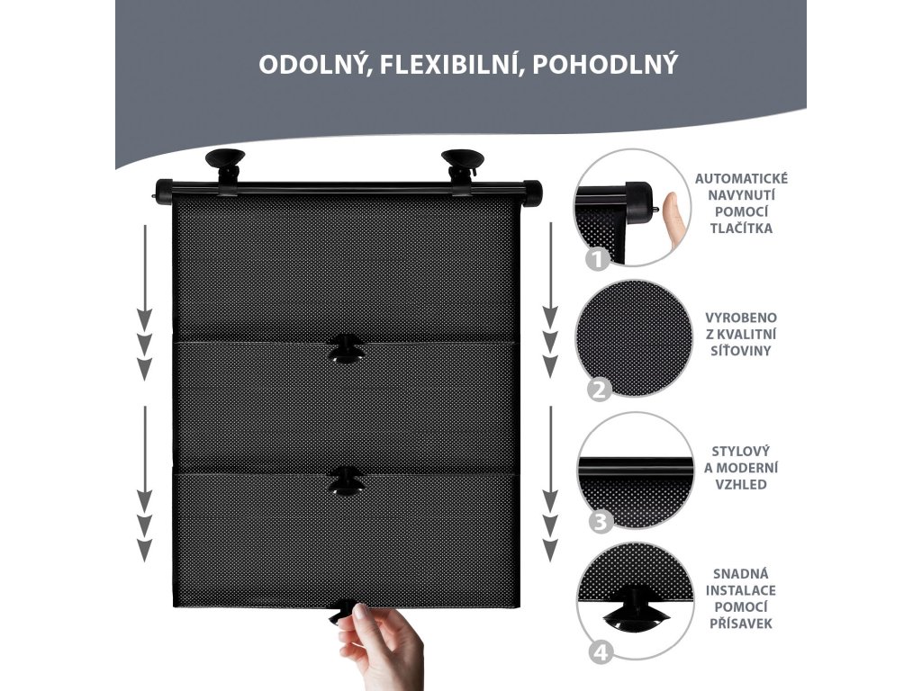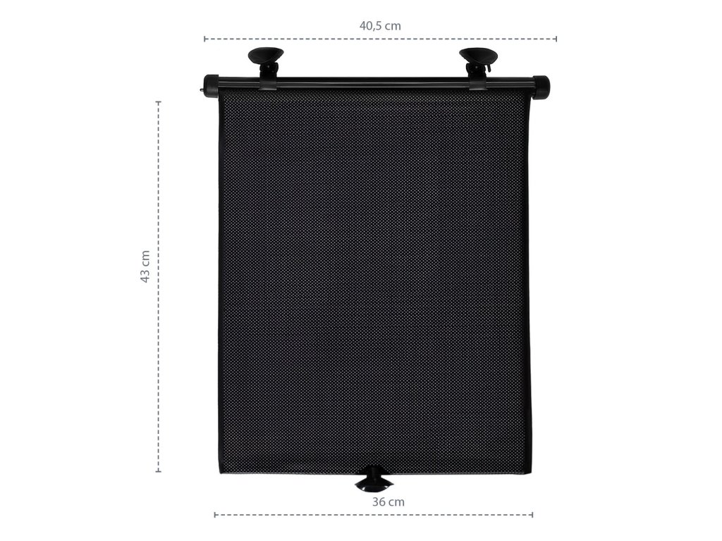 A feltekerhető napellenző praktikus segédeszköz az autós utazáshoz. A feltekerés egyszerű, csak egy gombot kell megnyomni. A tapadókorongoknak köszönhetően a napellenző biztonságosan, mozdulatlanul marad a helyén. Védi a gyermeket és a belső teret a nem kívánt napsugárzástól.