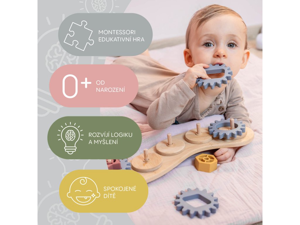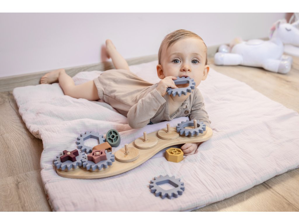 Fedezze fel a tanulás varázsát bambusz-szilikon kirakónkkal, amely összeköti a szórakozást a tudással. A színes fogaskerekek fejlesztik gyermeke finommotorikáját, logikai gondolkodását és képzelőerejét. A természetes bambusz és a biztonságos szilikon kombinációja kellemes szenzoros élményt nyújt, és támogatja a mechanika világának természetes felfedezését.