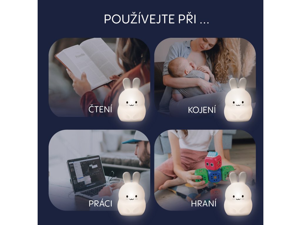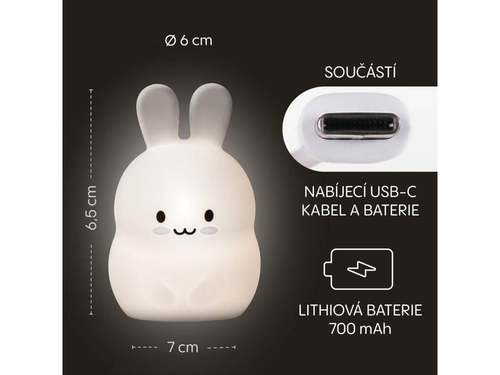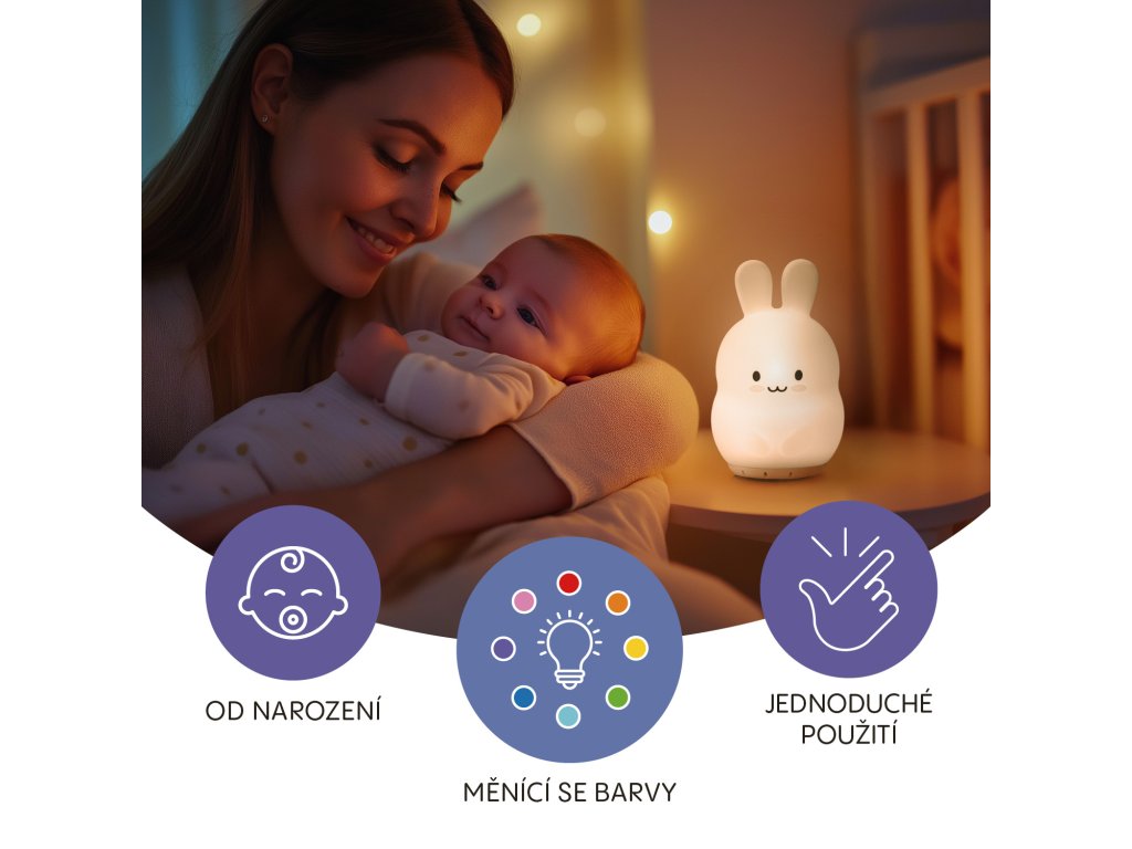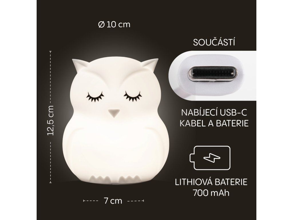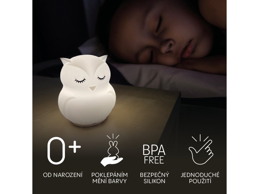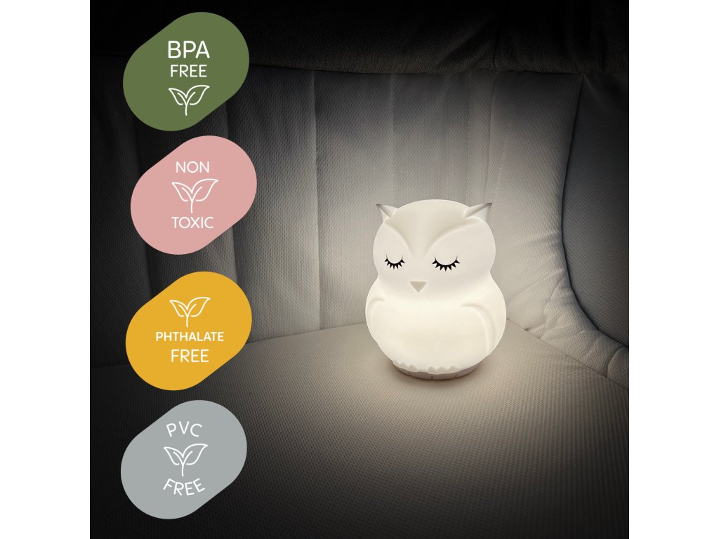 Tegye kellemesebbé gyermeke elalvását aranyos állat formájú éjszakai lámpánkkal. Kiválóan alkalmas kiegészítőnek a gyerekszobába vagy hordozható lámpának utazáshoz. Ideális közvetlenül a kiságyba helyezni is, ahol tompított fényével kellemes légkört teremt a zavartalan alváshoz. A lámpa rendkívül finom szilikonból készült, amely kellemes tapintású, tartós és biztonságos a legkisebb gyermekek számára is. Ezenkívül a szilikon rész könnyen elmosható mosogatógépben is, ami mindig higiénikus használatot garantál.