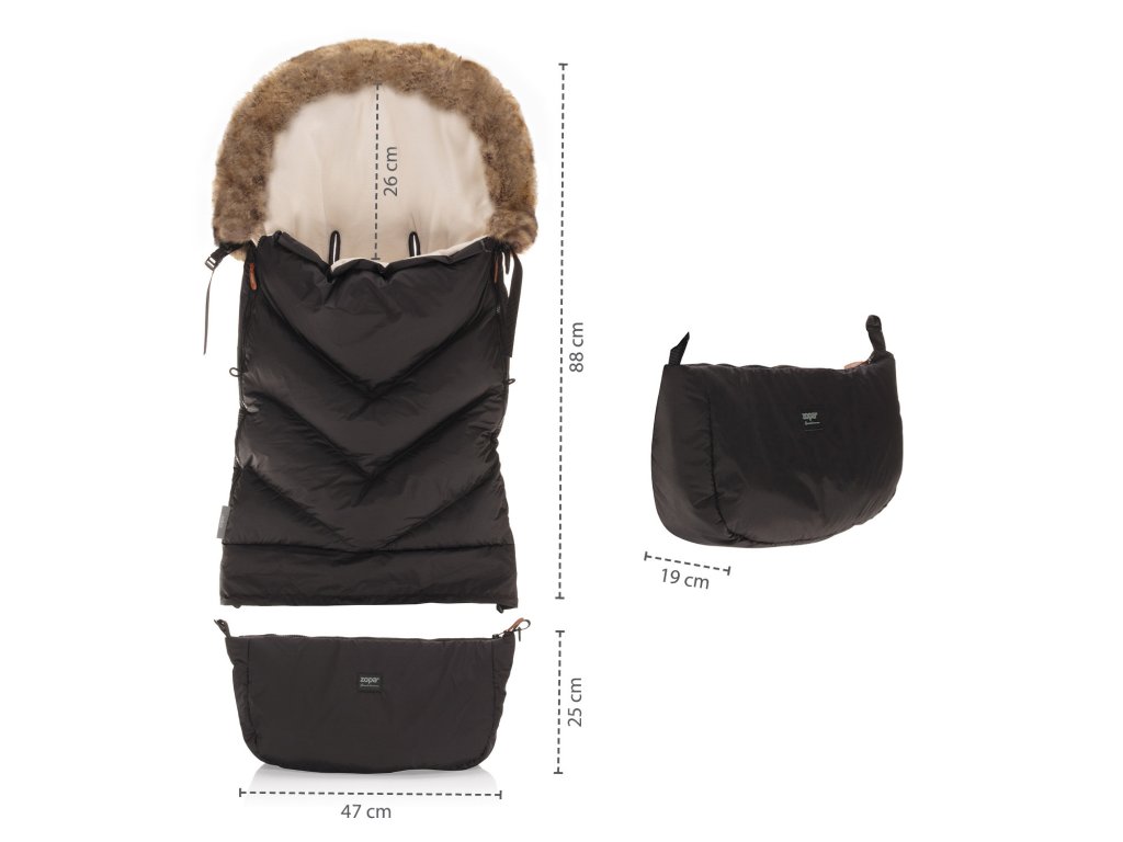Meleg lábzsák stílusos kivitelben, amely mély és sport babakocsikhoz is alkalmas. A lábzsák megvédi a gyermeket a hideg időjárástól, az esőtől és az erős széltől a szél- és vízálló felső anyagnak és a különösen meleg bélésnek köszönhetően, amelyet szőrme szegély egészít ki.