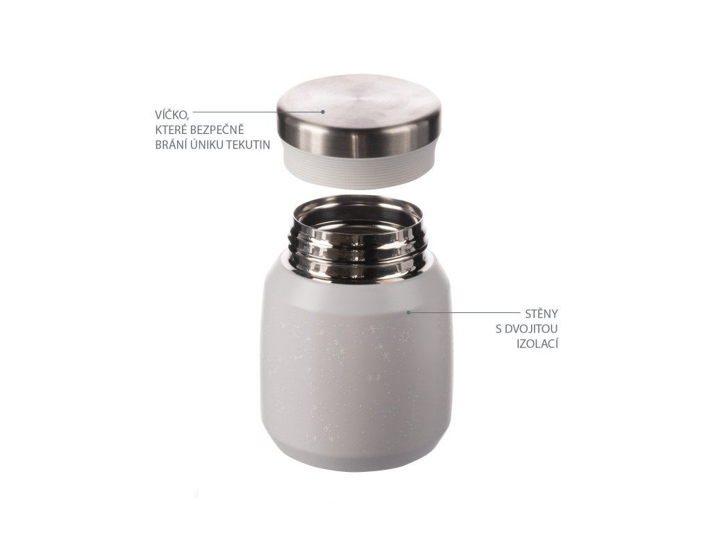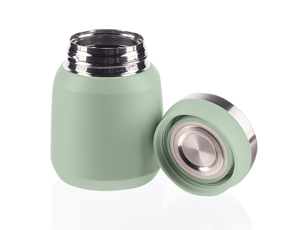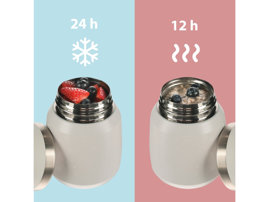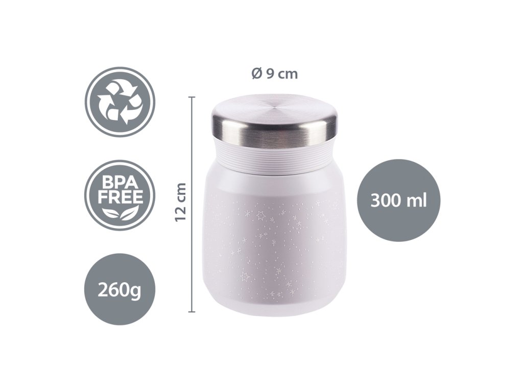 Kiváló minőségű termosz ételhez és snackhez, 300 ml-es űrtartalommal, a meleg ételeket akár 12 órán át melegen, a hideg ételeket pedig 24 órán át hidegen tartja. Minőségi rozsdamentes acélból készült, amely ellenáll a korróziónak. A szorosan záródó fedél biztosítja, hogy a termosz ne szivárogjon. A vákuumszigetelésnek köszönhetően a termosz kívülről nem melegszik fel, ha forró tartalommal van megtöltve.