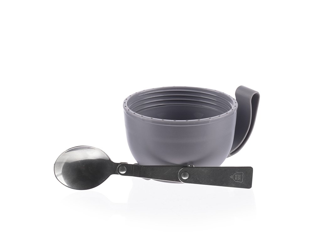 összecsukható kanalat, amely tökéletesen illeszkedik a kupakba, így gyermeke bárhol