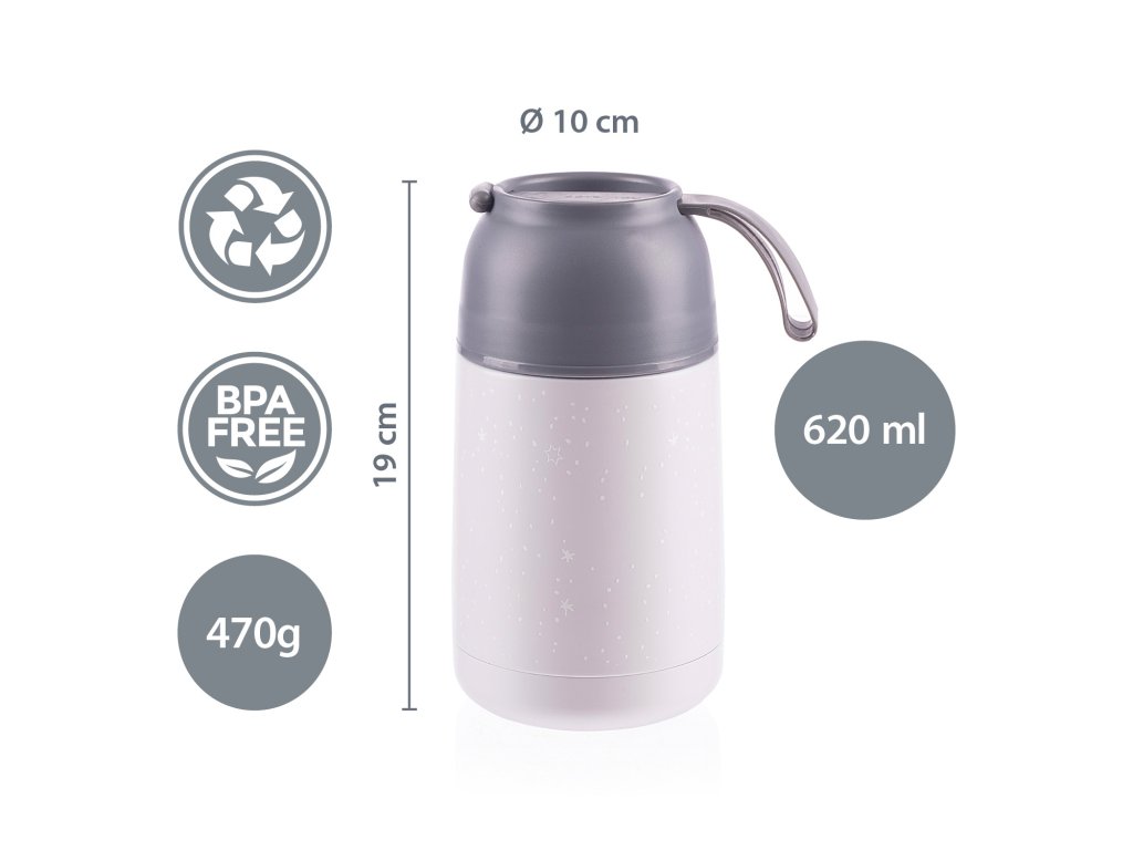 A minőségi, 620 ml-es folyadéktermosz akár 12 órán át melegen, és 24 órán át hidegen tartja az italokat. Minőségi rozsdamentes acélból készült, amely ellenáll a korróziónak. A szorosan záródó fedél biztosítja, hogy a termosz ne szivárogjon. A vákuumszigetelésnek köszönhetően a termosz kívülről nem melegszik fel, ha forró tartalommal van megtöltve. A kényelmes fogás érdekében a termosz szilikon tartóval van ellátva.