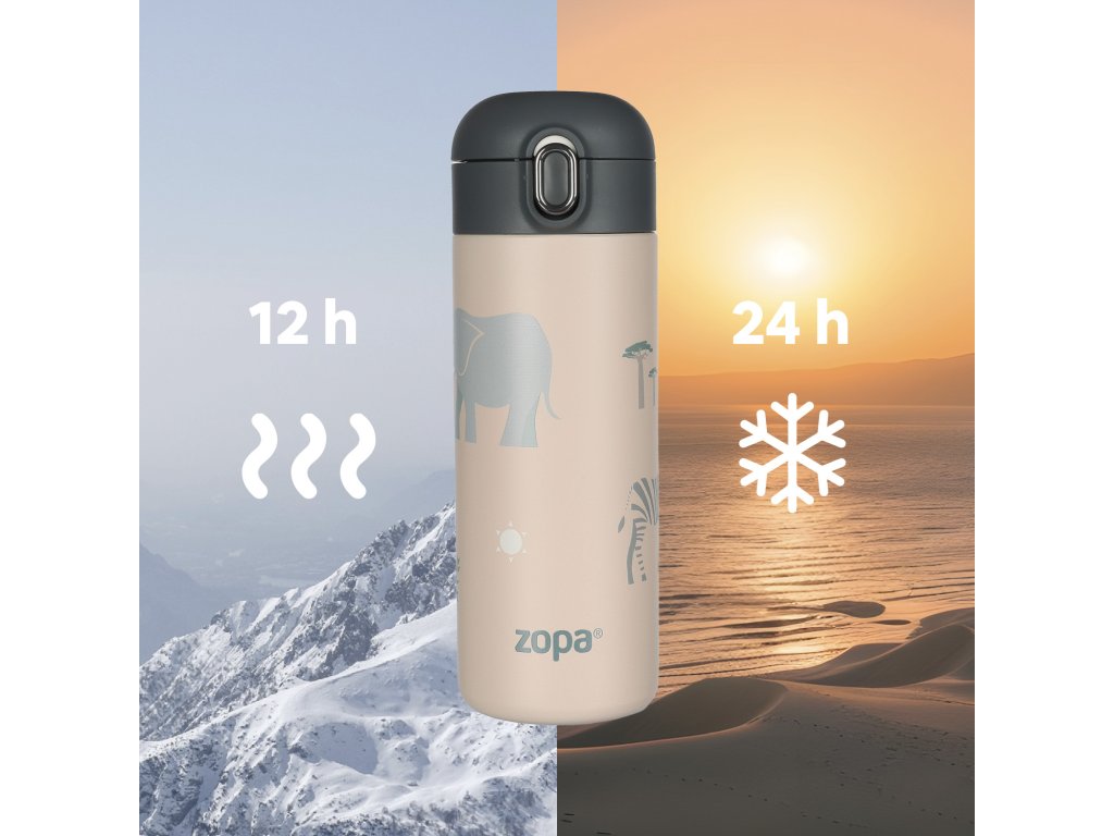 Semmi gond! A dizájnos, 400 ml-es termosz vidám motívumokkal, minőségi, légmentesen záródó fedéllel és dupla falú rozsdamentes acélból készült, így bármilyen folyadékot optimális hőmérsékleten tart hosszú ideig – a forró italokat akár 12 órán át melegen, a hideg italokat pedig akár 24 órán át hidegen tartja. Gyermeke így mindig kéznél tarthatja kedvenc italát, bárhová is induljon kalandozni.