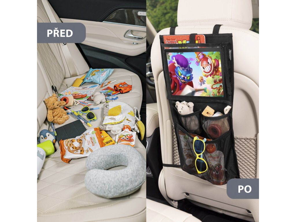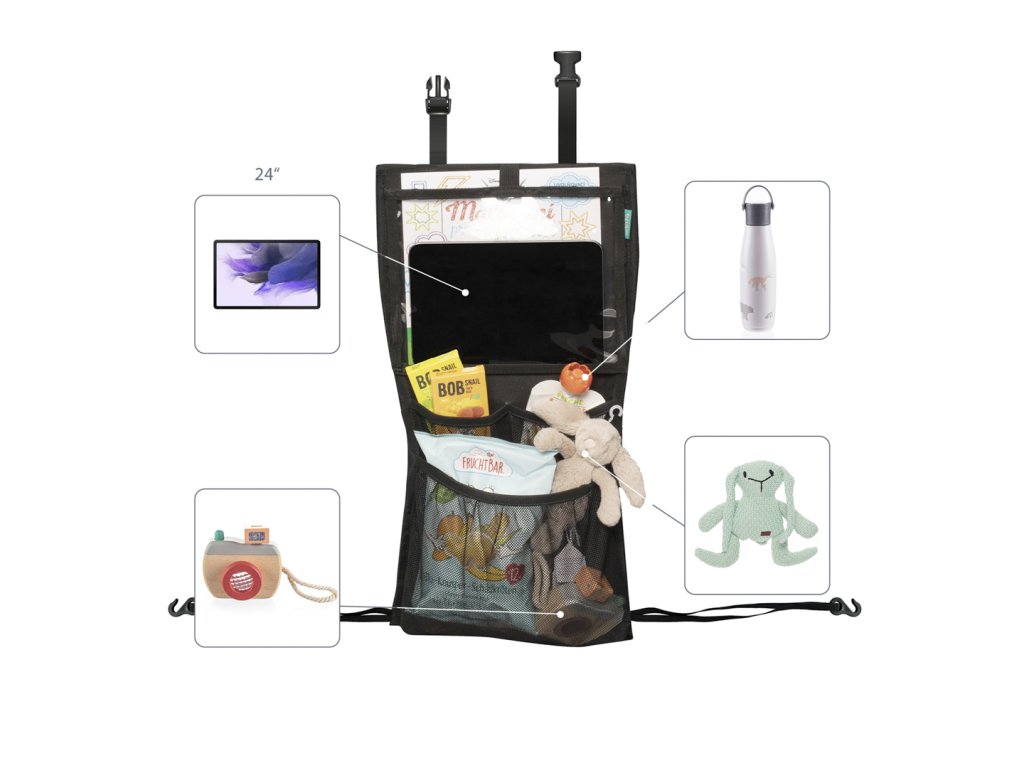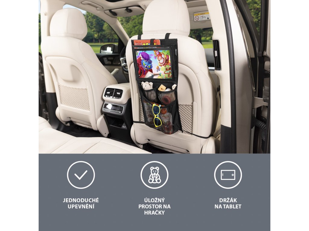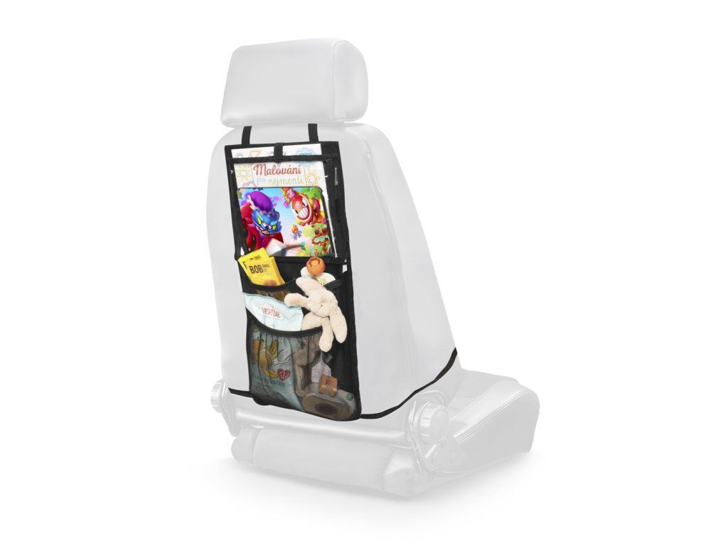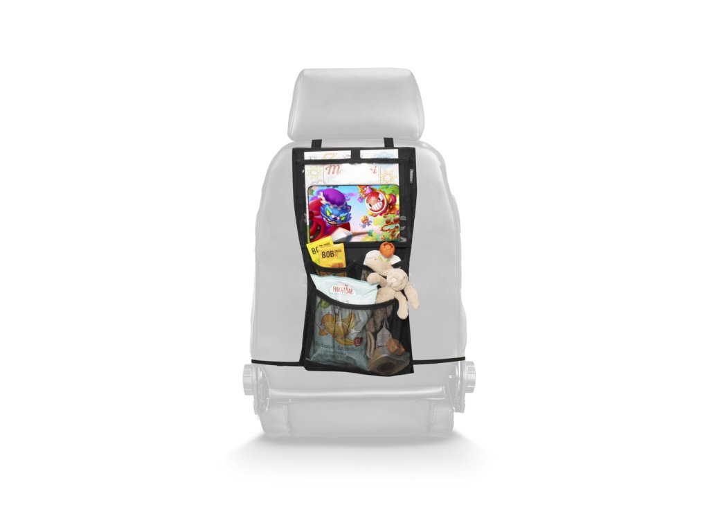 Okos és hatékony autósülés-szervező nemcsak az Ön utazását teszi kellemesebbé, hanem a táblagéptartó zsebnek köszönhetően a gyermekeiét is, akik szórakoztatóan nézhetnek meséket. A táblagéptartó zseb nagy, így akár 24 cm-es képátlójú táblagépet is el lehet benne helyezni. Két mély zseb további tárgyak számára, például játékok, kellemes utazási eszközzé teszik a szervezőt, amely segít rendet tartani a járműben még a legkisebbekkel való utazás során is. A szervező a csatoknak köszönhetően könnyen rögzíthető az ülés hátuljára, és könnyen eltávolítható.